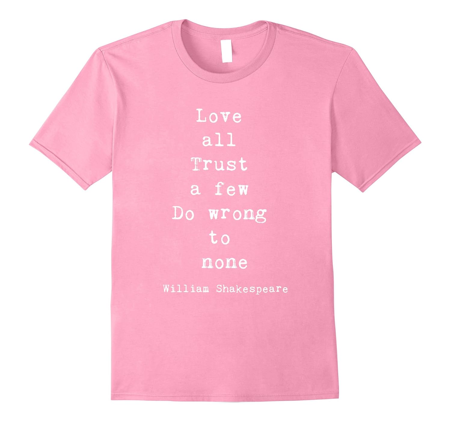 Solid colors: 100% Cotton; Heather Grey: 90% Cotton, 10% Polyester; All Other Heathers: 65% Cotton, 35% Polyester, Imported, Machine wash cold with like colors, dry low heat, Are you looking for a T-shirt that is unusual and meaningful. This Shakespeare quote Love All Trust A Few Do Wrong To None shirt is not a mainstream shirt and will get you a lot of attention when you wear it, The grunge old typewriter font adds a nostalgic touch and this cool T-shirt is so cool for nerds and for everybody who wants to stand out, makes also a unique Christmas or birthday present for a friend or relative, Lightweight, Classic fit, Double-needle sleeve and bottom hem