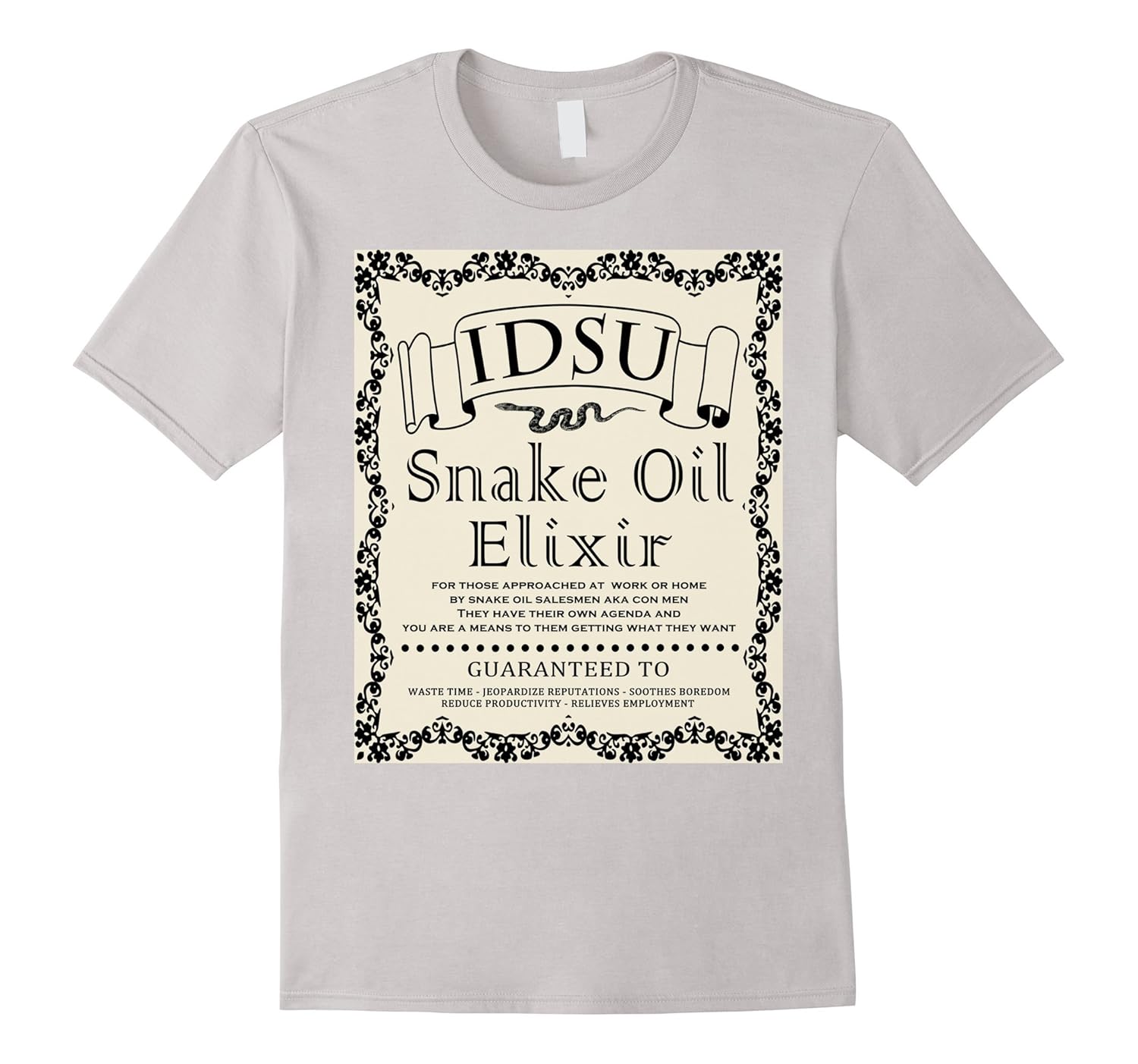 Solid colors: 100% Cotton; Heather Grey: 90% Cotton, 10% Polyester; All Other Heathers: 65% Cotton, 35% Polyester; Imported; Machine wash cold with like colors, dry low heat; This funny T-shirt is perfect for any salesmen, doctor, nurses, nutritionist, pharmacist, or anyone in the sales or medical field.; This is a retro design label for Snake Oil, it is reminiscent of yellowed antiqued parchment labels.; Lightweight, Classic fit, Double-needle sleeve and bottom hem