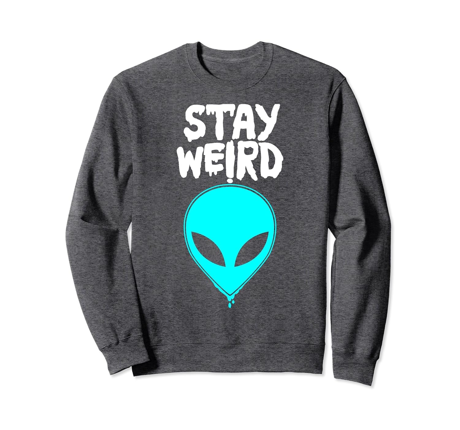 Solid colors: 80% Cotton, 20% Polyester; Heather Grey: 78% Cotton, 22% Poly; Dark Heather: 50% Cotton, 50% Polyester; Imported; Machine wash cold with like colors, dry low heat; Alien sweatshirt for women, men or teens. If youre an E.T. at heart, this alien sweatshirt is for you. Inspirational quote Stay Weird represents being yourself Andamp; staying true to your soul.; Psychedelic weirdo sweatshirt features UFO alien head with large eyes Andamp; dripping blood. Perfect hoodie for UFO believers Andamp; people with a passion for outer space. The disclosure is here!; 8.5 oz, Classic fit, Twill-taped neck