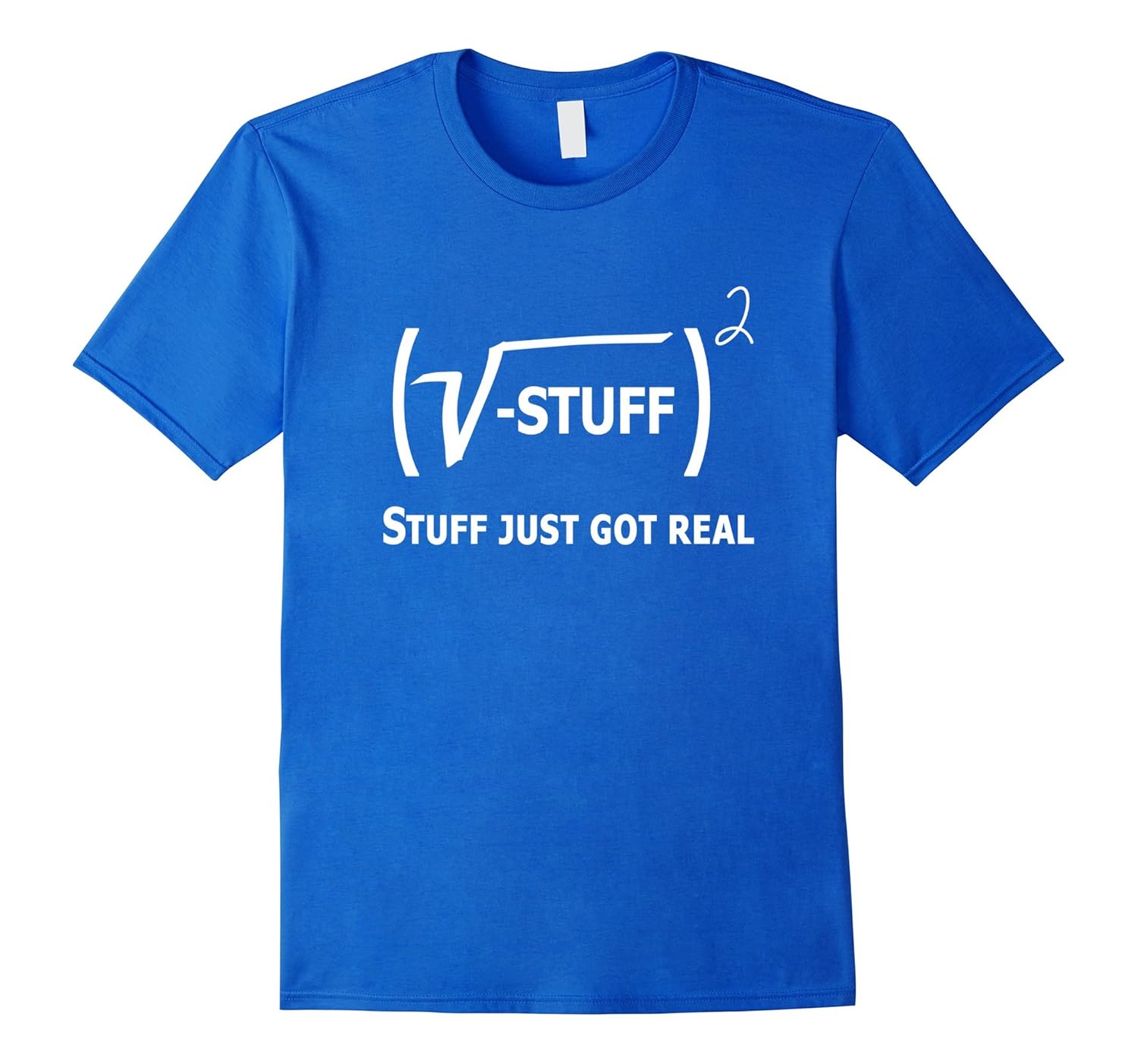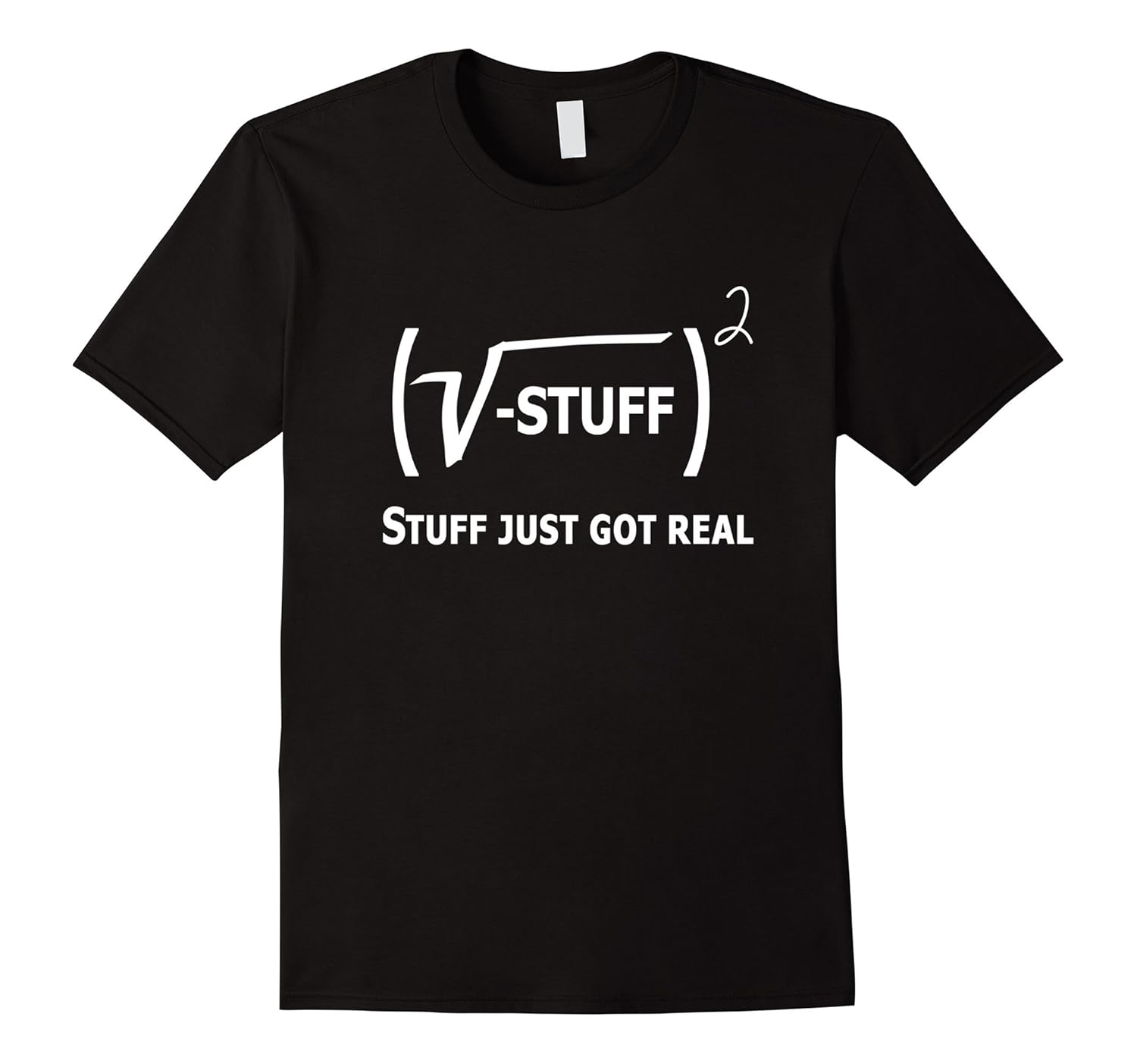 Solid colors: 100% Cotton; Heather Grey: 90% Cotton, 10% Polyester; All Other Heathers: 65% Cotton, 35% Polyester; Imported; Machine wash cold with like colors, dry low heat; This is a great Funny math shirt for all ages. Great for students, professors, teachers, geeks, and self proclaimed nerds! Makes you think when you look at it. A square root sign with a negative Stuff in brackets squared with big bold text, stuff just got real! Funny shirt for science and math lovers. This one will turn heads and get people talking and asking questions.; This shirt makes the best gift idea for Moms, Dads and friends and family looking for something that makes a statement. People will think this shirt is so hot and you will be the envy of all. You will be trendy and show your solidarity with this protest tee. This makes a great addition to any winter or spring wardrobe!; Lightweight, Classic fit, Double-needle sleeve and bottom hem