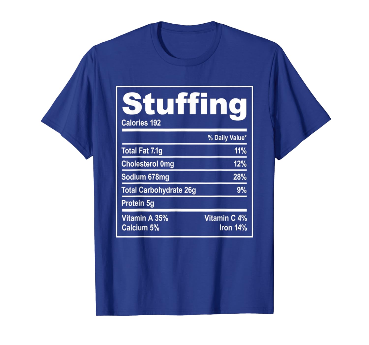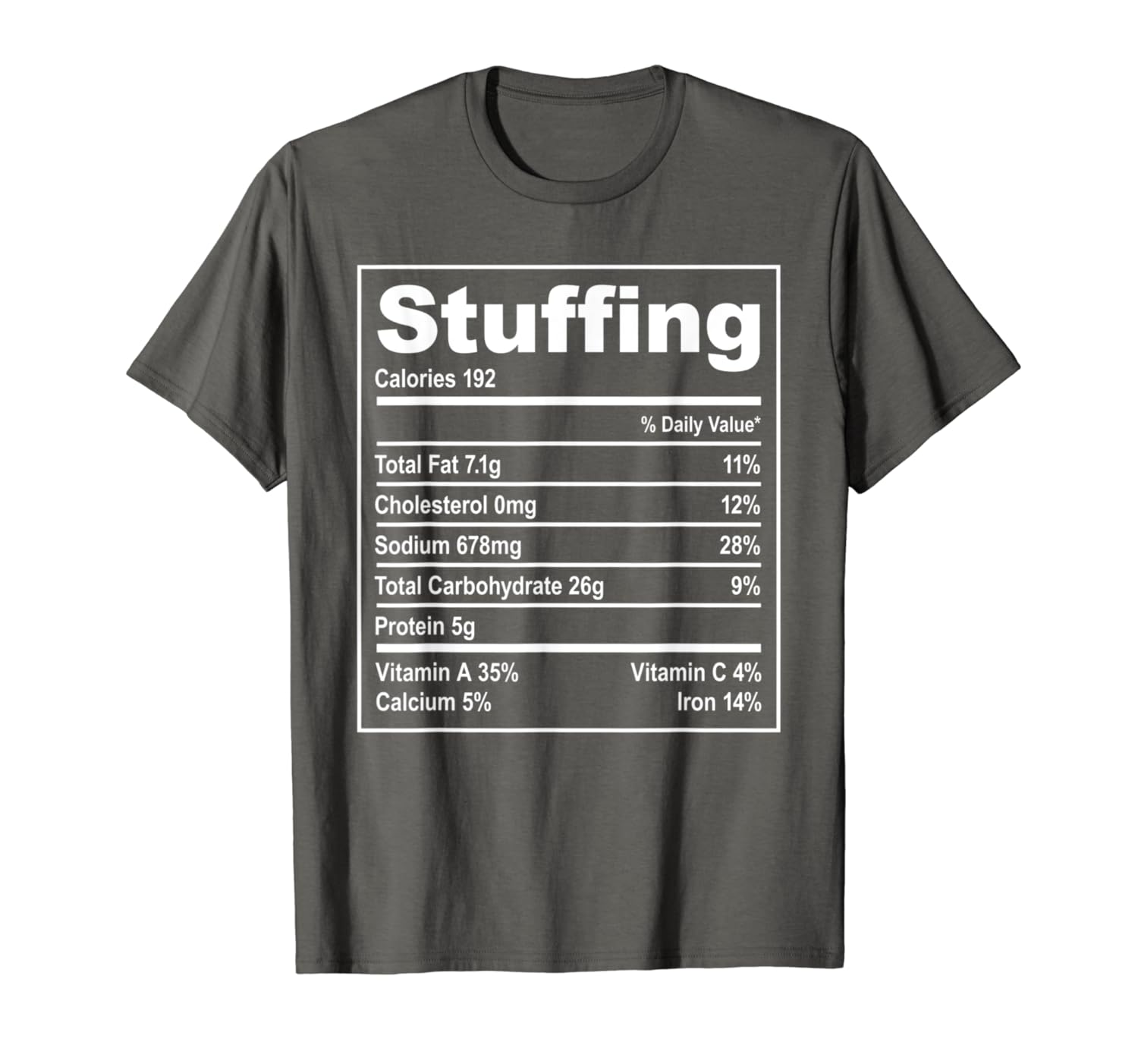 Solid colors: 100% Cotton; Heather Grey: 90% Cotton, 10% Polyester; All Other Heathers: 50% Cotton, 50% Polyester; Imported; Machine wash cold with like colors, dry low heat; Stuffing Nutrition Facts Costume Funny Thanksgiving; Lightweight, Classic fit, Double-needle sleeve and bottom hem