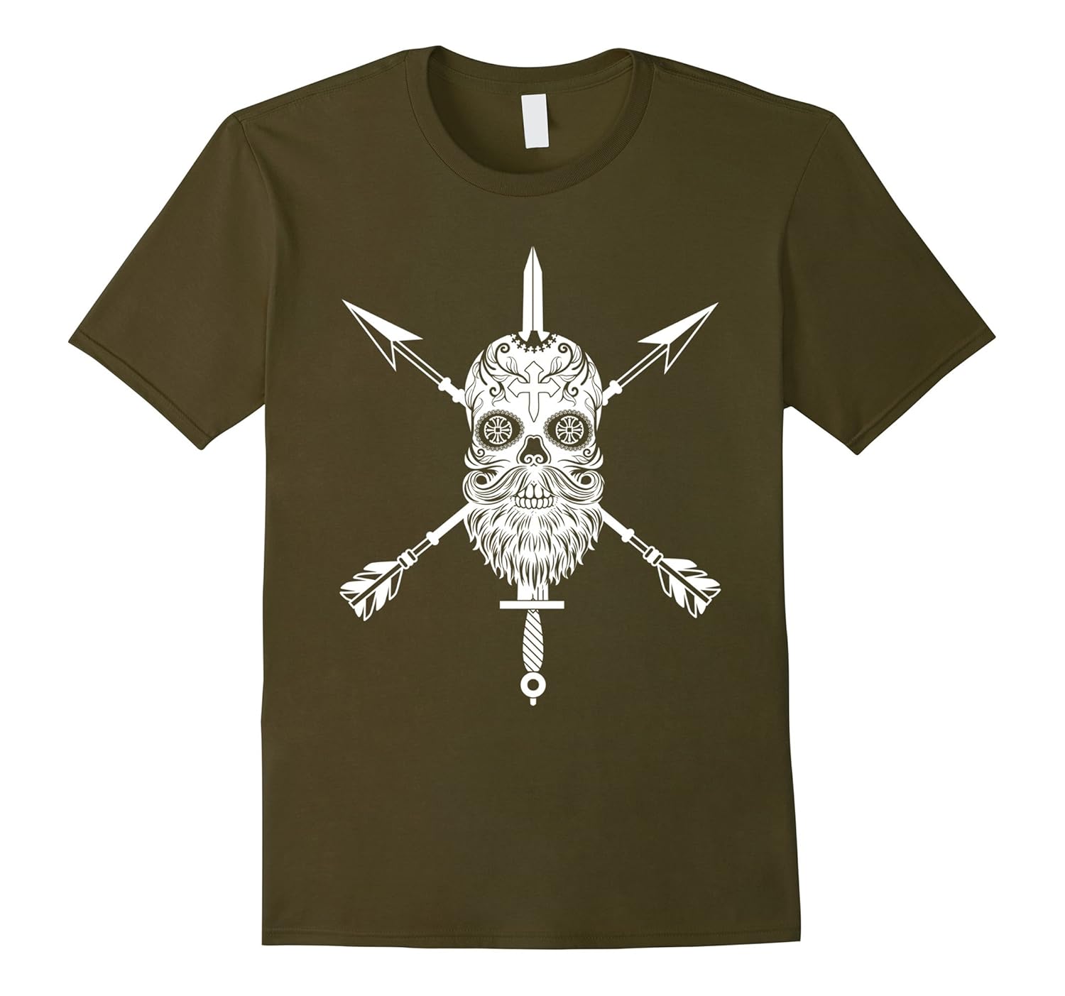 Solid colors: 100% Cotton; Heather Grey: 90% Cotton, 10% Polyester; All Other Heathers: 65% Cotton, 35% Polyester, Imported, Machine wash cold with like colors, dry low heat, Have a great time celebrating Halloween on October 31st with this beautifully designed sugar skull halloween shirt. Features a bearded candy skull with crossed arrows and a fighting knife through the center of the skull. Wonderful gift for a Veteran. Perfect for halloween, Day of the Dead celebrations, Dia de los Muertos fiestas, trick or treating, carving pumpkins, visiting a haunted house, Veterans Day or Memorial Day. Can be worn any day of the week as a cool hip fashion statement. Lightweight, Classic fit, Double-needle sleeve and bottom hem