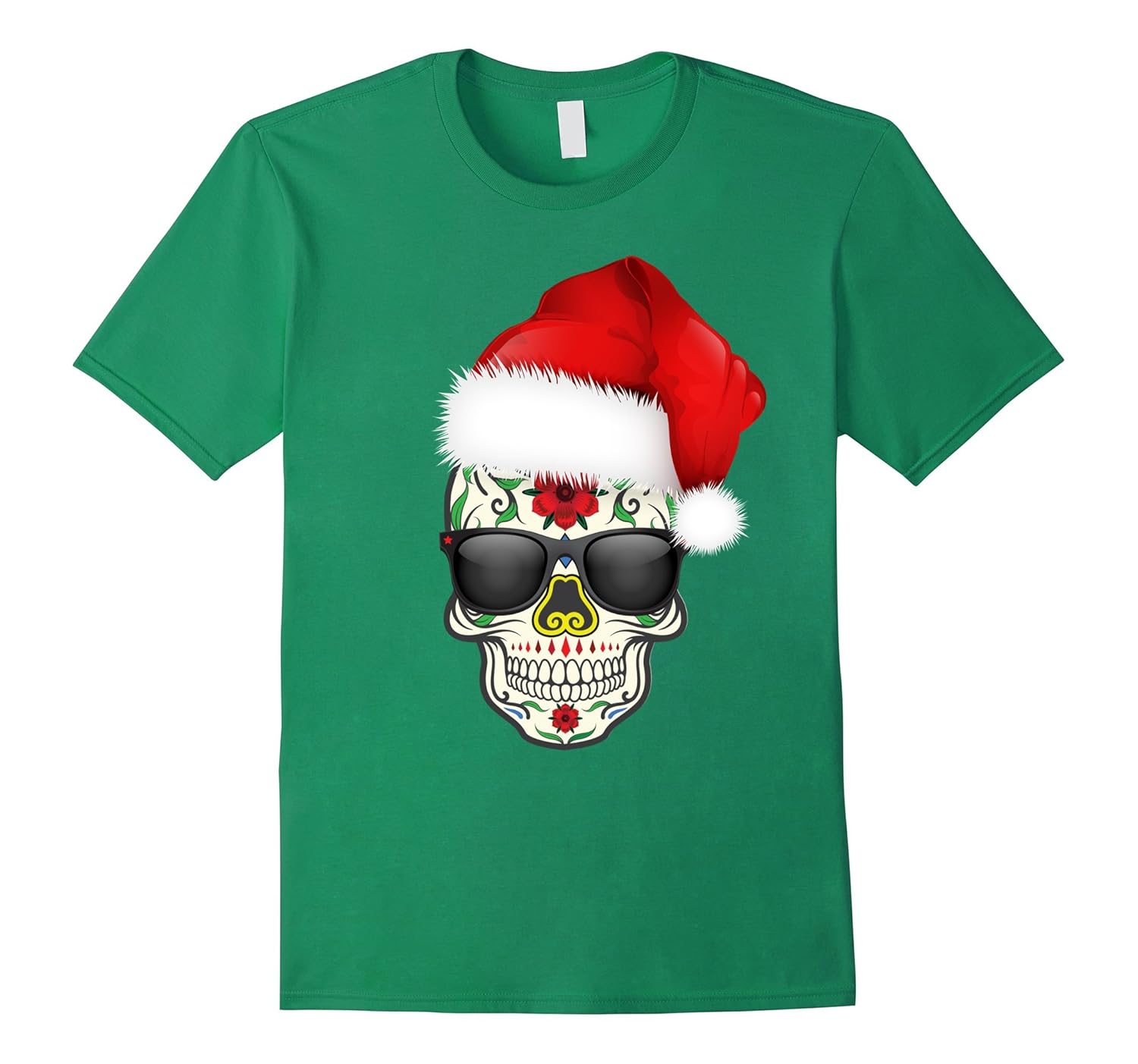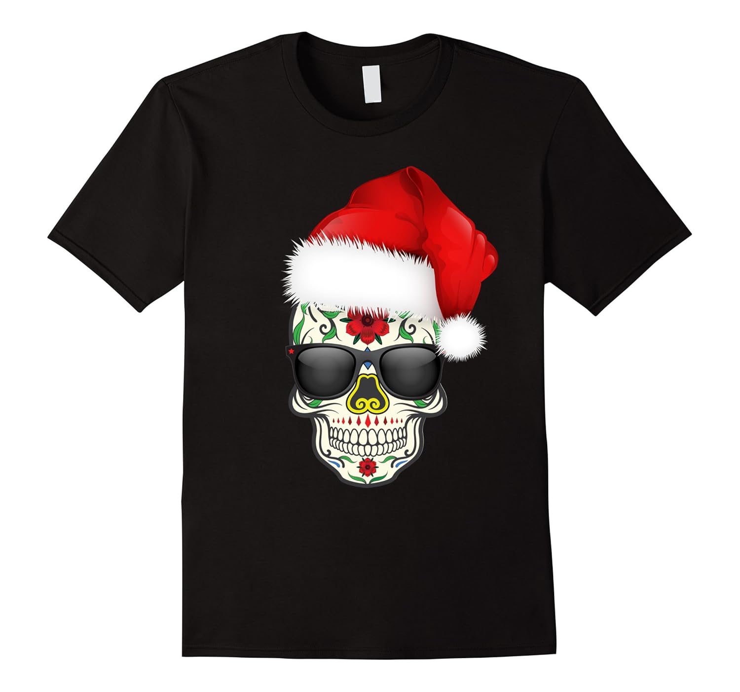 Solid colors: 100% Cotton; Heather Grey: 90% Cotton, 10% Polyester; All Other Heathers: 65% Cotton, 35% Polyester; Imported; Machine wash cold with like colors, dry low heat; Day of the Dead sugar skull meets cool Santa Claus with dark sunglasses with this hip and trendy candy skull. Great shirt for celebrating in style this holiday party season. You will certainly stand out in a crowd.; Perfect for an ugly sweater party, halloween, Day of the Dead / Dia de los Muertos celebration, trick or treating, carving pumpkins, visiting a haunted house, holiday party or Christmas party.; Lightweight, Classic fit, Double-needle sleeve and bottom hem