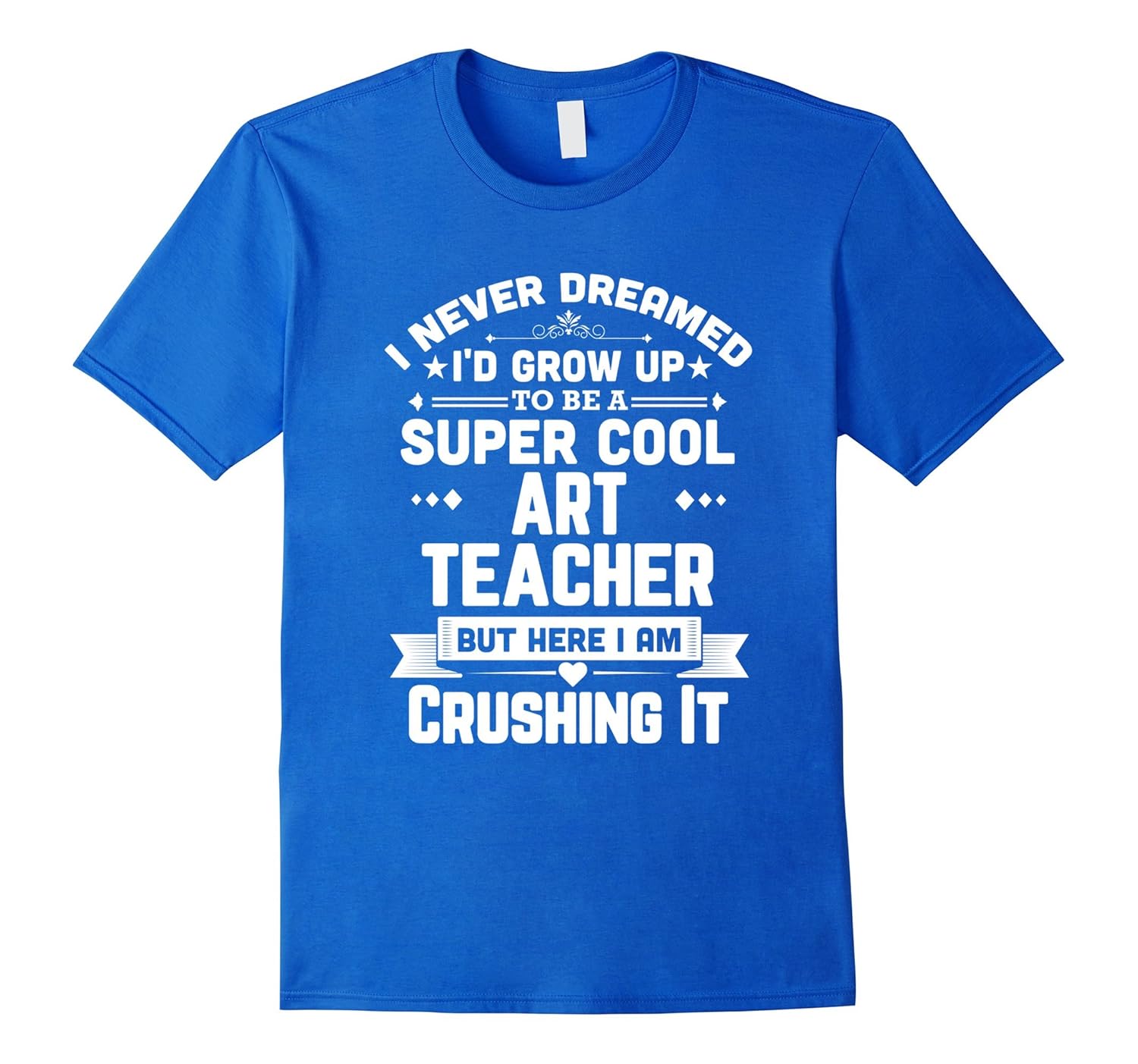 Solid colors: 100% Cotton; Heather Grey: 90% Cotton, 10% Polyester; All Other Heathers: 65% Cotton, 35% Polyester; Imported; Machine wash cold with like colors, dry low heat; I Never Dreamed Id Grow Up To Be A Super Cool Art Teacher But Here I Am Crushing It Funny Teaching T-Shirt. Both male and female teachers will appreciate the humor of this classic shirt. Perfect Happy Teachers Day gift. Teachers will love this tee.; Perfect shirt for Teachers Appreciation Day and makes a great 1st day of school outfit. Makes a great graduation gift for the new teacher. Great Back-To-School wear. Makes an excellent Birthday or Christmas gift for your childs favorite teacher.; Lightweight, Classic fit, Double-needle sleeve and bottom hem