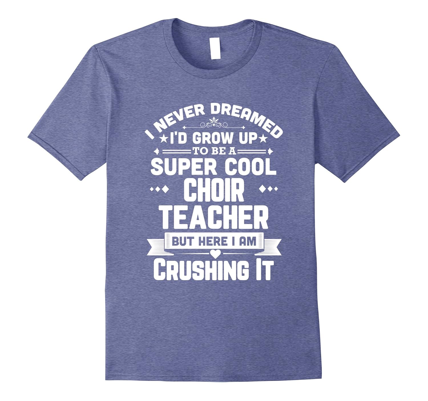 Solid colors: 100% Cotton; Heather Grey: 90% Cotton, 10% Polyester; All Other Heathers: 65% Cotton, 35% Polyester; Imported; Machine wash cold with like colors, dry low heat; I Never Dreamed Id Grow Up To Be A Super Cool Choir Teacher But Here I Am Crushing It Funny Teaching T-Shirt. Both male and female teachers will appreciate the humor of this classic shirt. Perfect Happy Teachers Day gift. Teachers will love this tee.; Perfect shirt for Teachers Appreciation Day and makes a great 1st day of school outfit. Makes a great graduation gift for the new teacher. Great Back-To-School wear. Makes an excellent Birthday or Christmas gift for your childs favorite teacher.; Lightweight, Classic fit, Double-needle sleeve and bottom hem