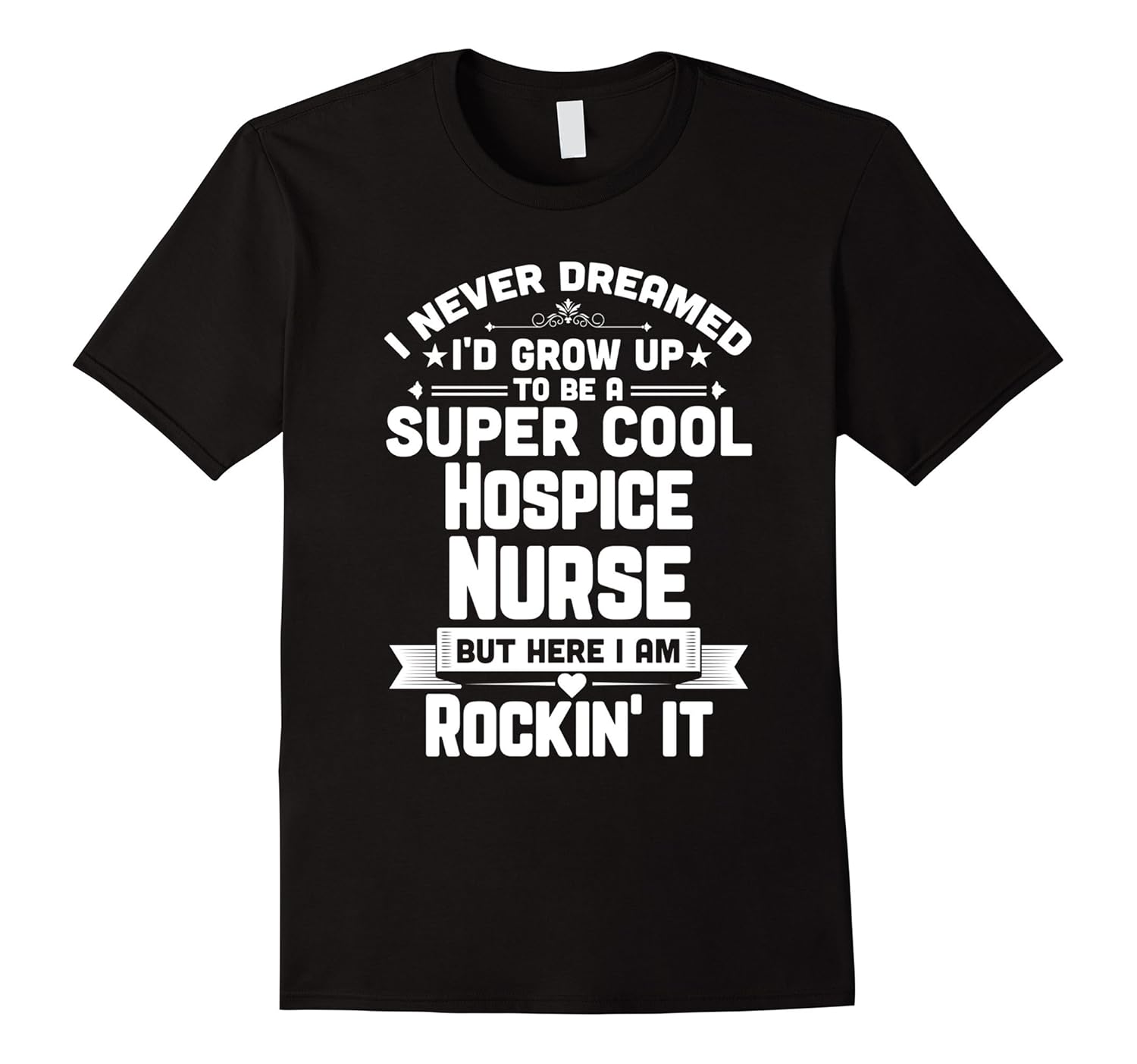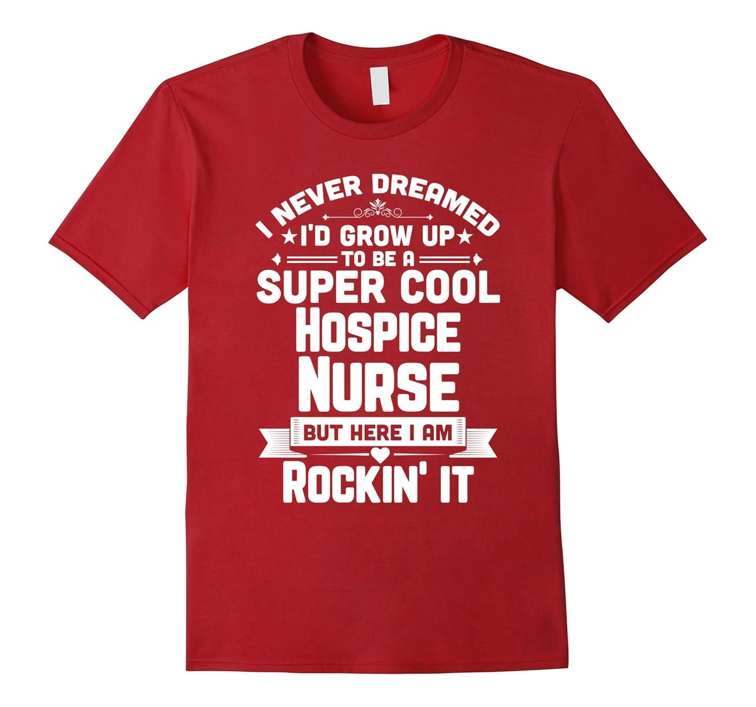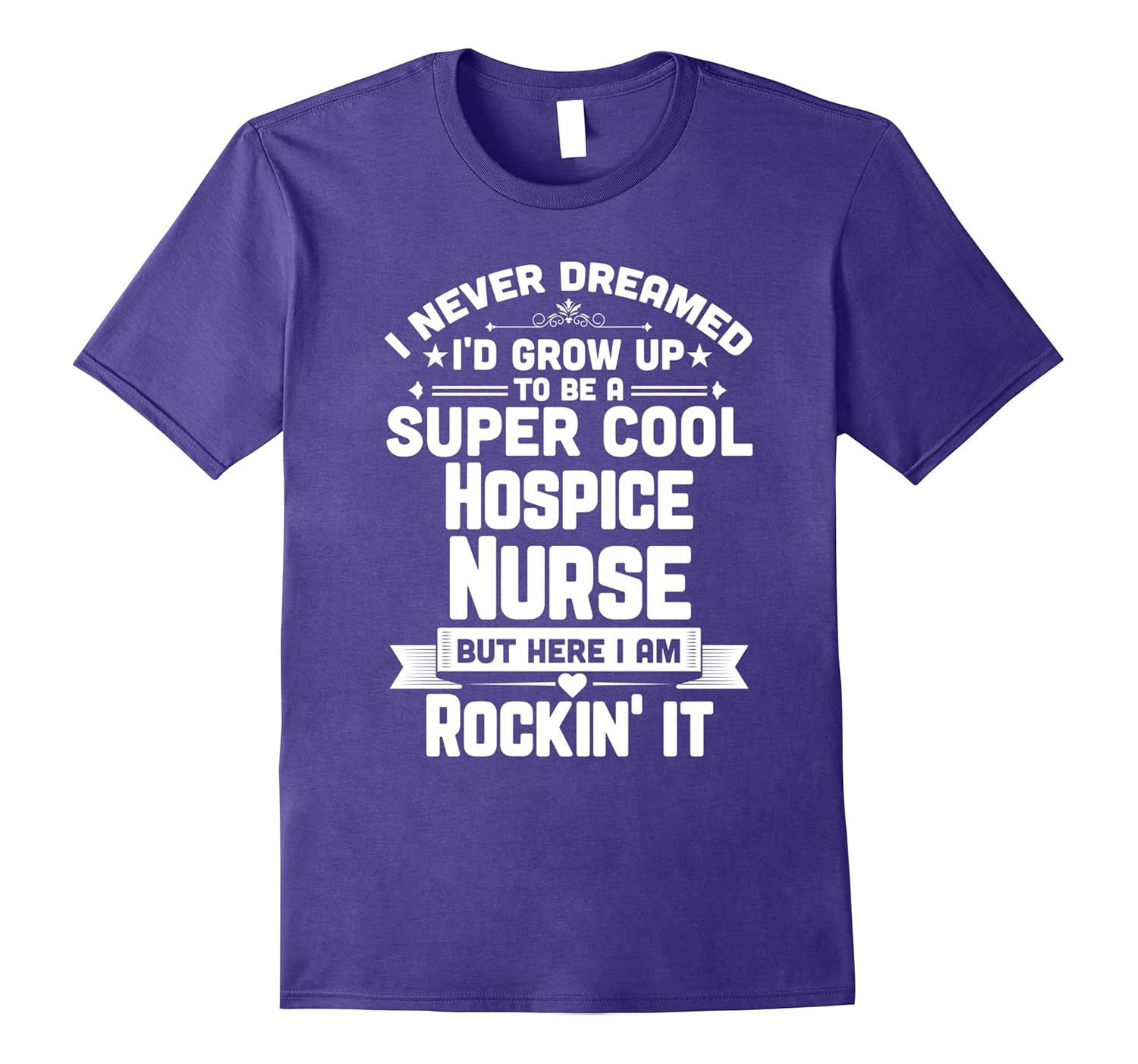 Solid colors: 100% Cotton; Heather Grey: 90% Cotton, 10% Polyester; All Other Heathers: 50% Cotton, 50% Polyester; Imported; Machine wash cold with like colors, dry low heat; I Never Dreamed Id Grow Up To Be A Super Cool Hospice Nurse But Here I Am Rockin It Funny Nursing Apparel T-Shirt. Excellent gift idea for nurses. If youre looking for a cute tee for your favorite nurse this is the shirt for you.; Makes a great gift for the passionate nurse who likes expressive apparel. An excellent t-shirt to give as a gift to your husband, wife, best friend, mom, dad, brother or sister who are professional nurses or nursing graduates.; Lightweight, Classic fit, Double-needle sleeve and bottom hem