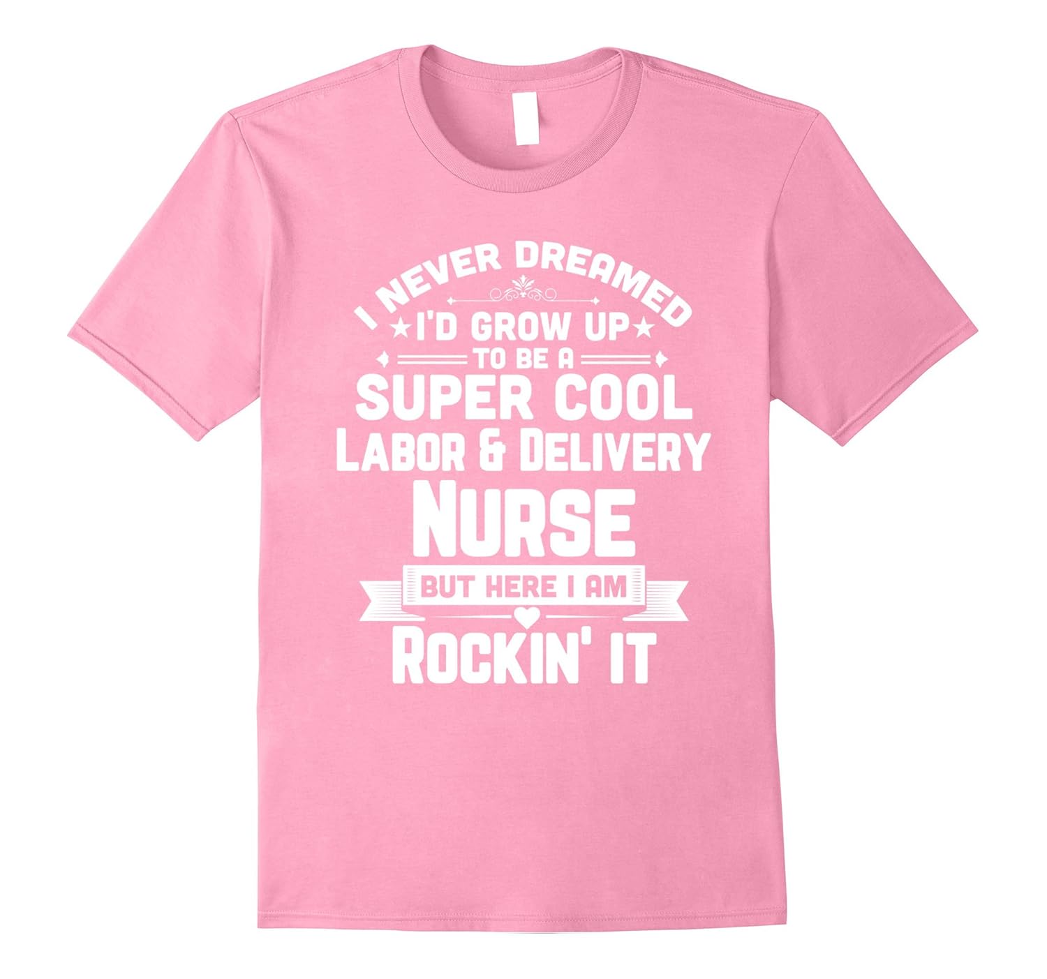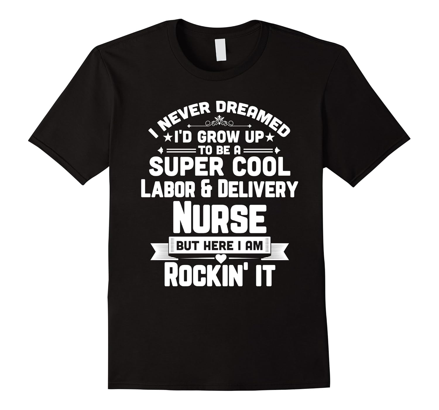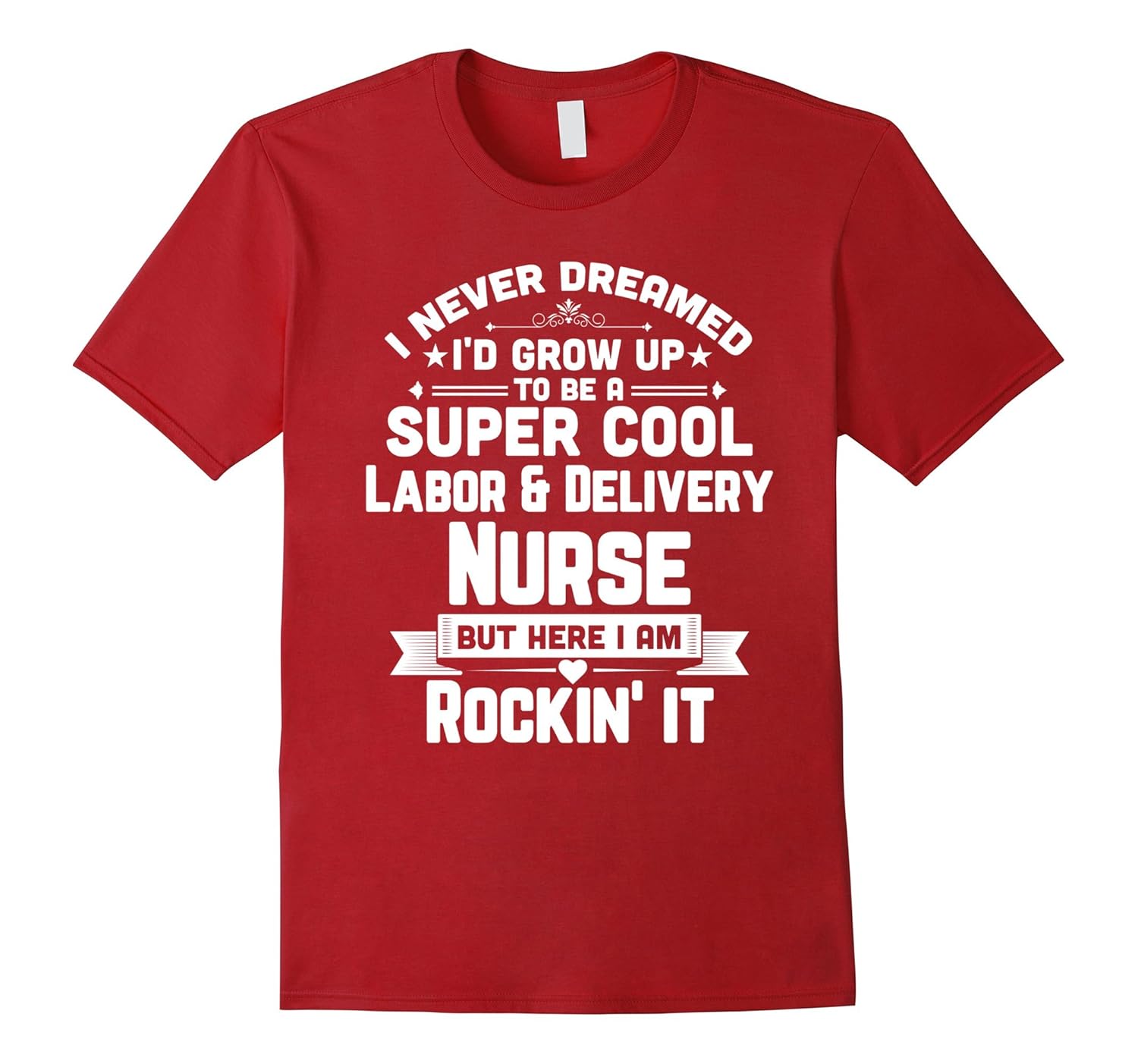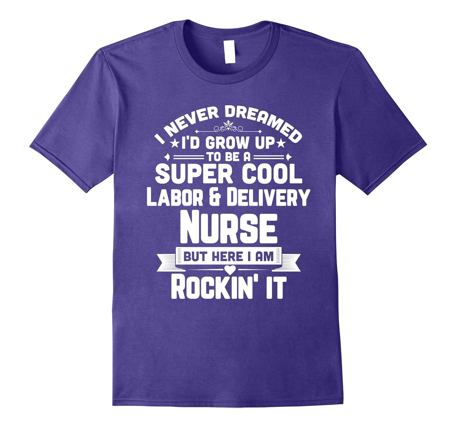 Solid colors: 100% Cotton; Heather Grey: 90% Cotton, 10% Polyester; All Other Heathers: 50% Cotton, 50% Polyester; Imported; Machine wash cold with like colors, dry low heat; I Never Dreamed Id Grow Up To Be A Super Cool Labor Andamp; Delivery Nurse But Here I Am Rockin It Funny Nursing Apparel T-Shirt. Excellent gift idea for nurses. If youre looking for a cute tee for your favorite nurse this is the shirt for you.; Makes a great gift for the passionate nurse who likes expressive apparel. An excellent t-shirt to give as a gift to your husband, wife, best friend, mom, dad, brother or sister who are professional nurses or nursing graduates.; Lightweight, Classic fit, Double-needle sleeve and bottom hem