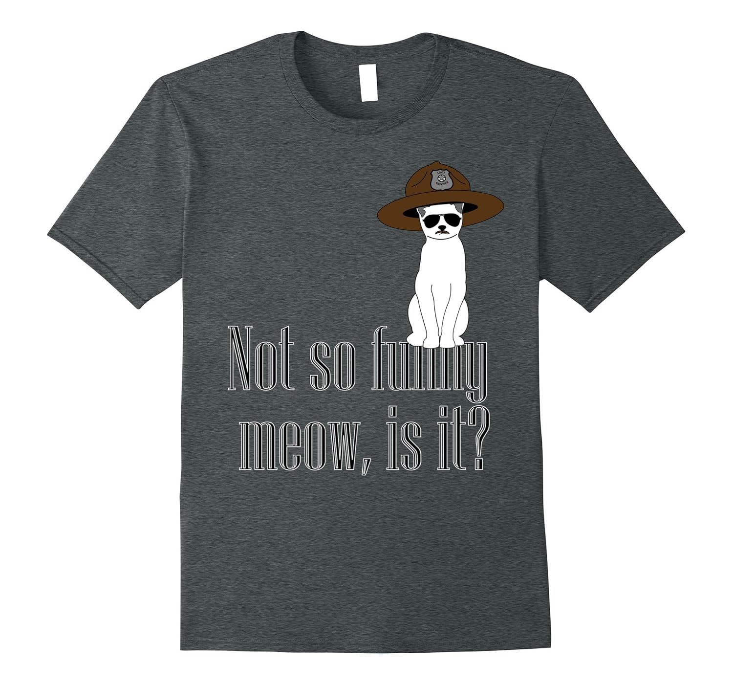 Solid colors: 100% Cotton; Heather Grey: 90% Cotton, 10% Polyester; All Other Heathers: 65% Cotton, 35% Polyester, Imported, Machine wash cold with like colors, dry low heat, This cool cat is sporting a State Trooper hat and super aviator shades. He is also sporting a nice brown mustache. “Not so funny meow, is it” is displayed below this police kitty. This cat is a super cop when he wears the badge. Lightweight, Classic fit, Double-needle sleeve and bottom hem