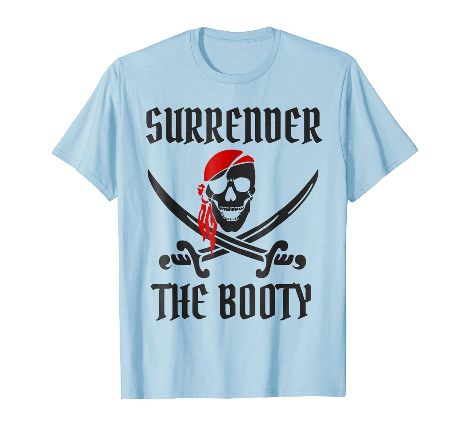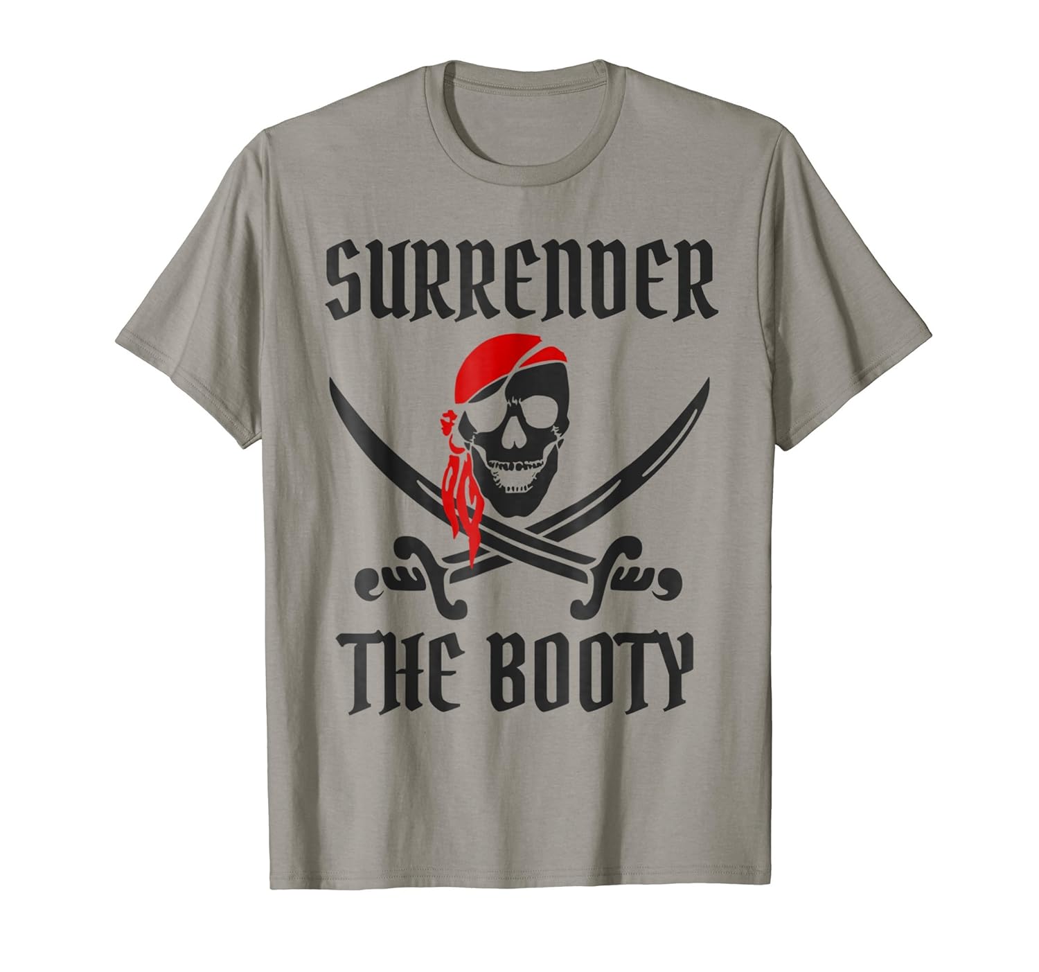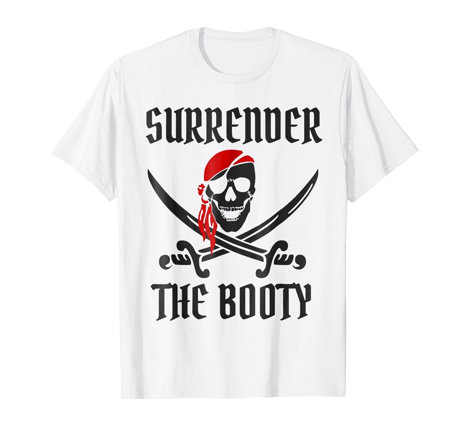 Solid colors: 100% Cotton; Heather Grey: 90% Cotton, 10% Polyester; All Other Heathers: 50% Cotton, 50% Polyester; Imported; Machine wash cold with like colors, dry low heat; This funny pirate t-shirt for adults or kids features a scary pirate skull and crossbones. It says Surrender The Booty. This funny pirate t shirt is the ideal gift for you pirate loving son, daughter, nephew, niece, brother or sister for christmas.; Wear this pirate shirt for Halloween or Talk like a pirate day or any day. This pirate tee shirt is a great birthday gift for any pirate fan.; Lightweight, Classic fit, Double-needle sleeve and bottom hem