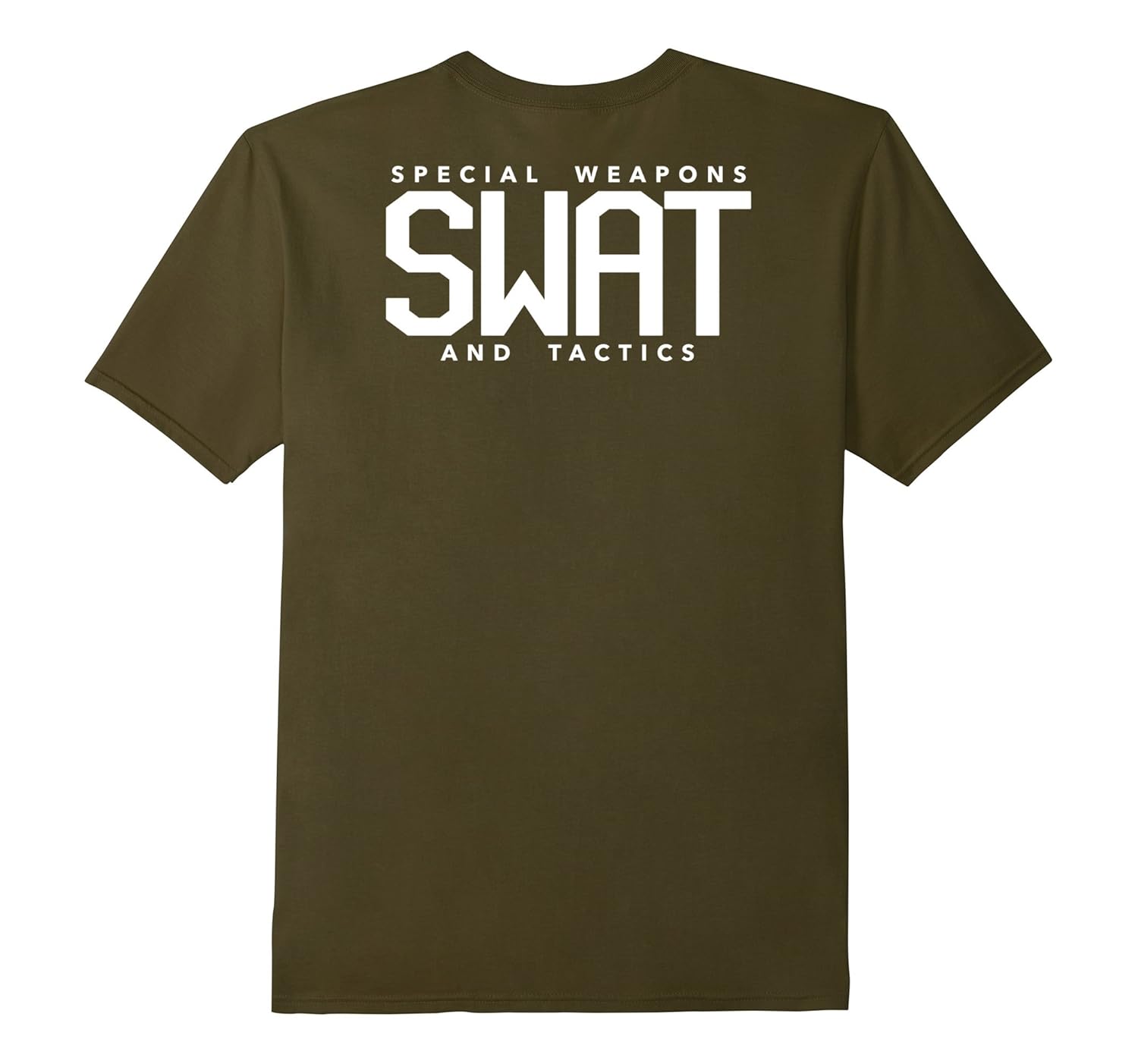 Solid colors: 100% Cotton; Heather Grey: 90% Cotton, 10% Polyester; All Other Heathers: 65% Cotton, 35% Polyester, Imported, Machine wash cold with like colors, dry low heat, Shirt is printed on the back with an official S.W.A.T logo in large print. Tee for deputies, police, private security, police, guards, businesses, restaurants jail guards and wardens, costumes, halloween law enforcement officers. Wear this short sleeve tee shirt on patrol, on duty, to work, halloween, for loss prevention. For sheriffs, deputies, deputy sheriff, filmmakers costume designers, plays. Lightweight, Classic fit, Double-needle sleeve and bottom hem