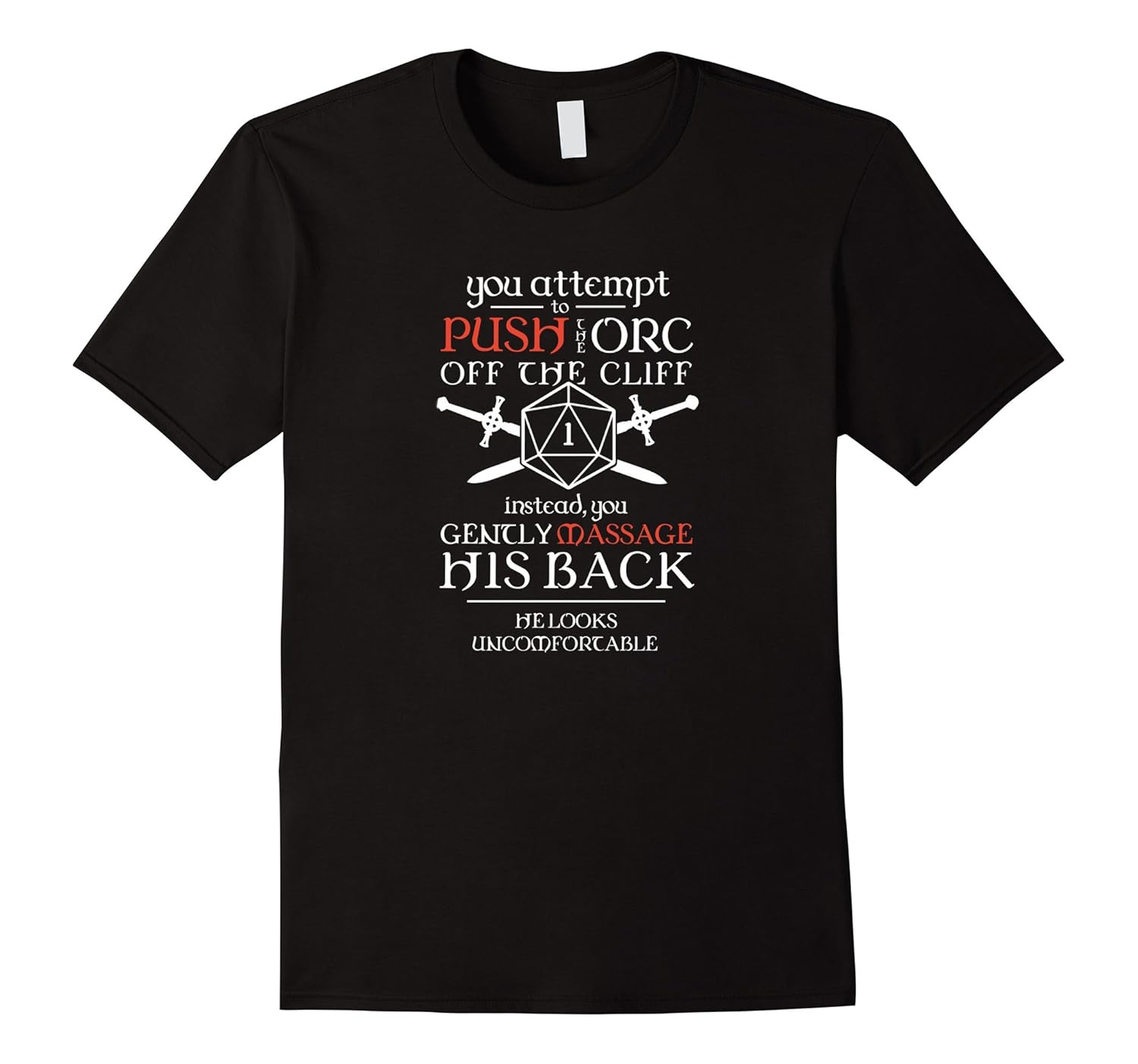 Solid colors: 100% Cotton; Heather Grey: 90% Cotton, 10% Polyester; All Other Heathers: 65% Cotton, 35% Polyester, Imported, Machine wash cold with like colors, dry low heat, Perfect funny tee for your next tabletop RPG dungeon crawl. Perfect for geeky dragon slayers and D20 critical failure scenarios. “You attempt to push the orc off the cliff. Instead, you gently massage his back. He looks uncomfortable.”, Lightweight, Classic fit, Double-needle sleeve and bottom hem