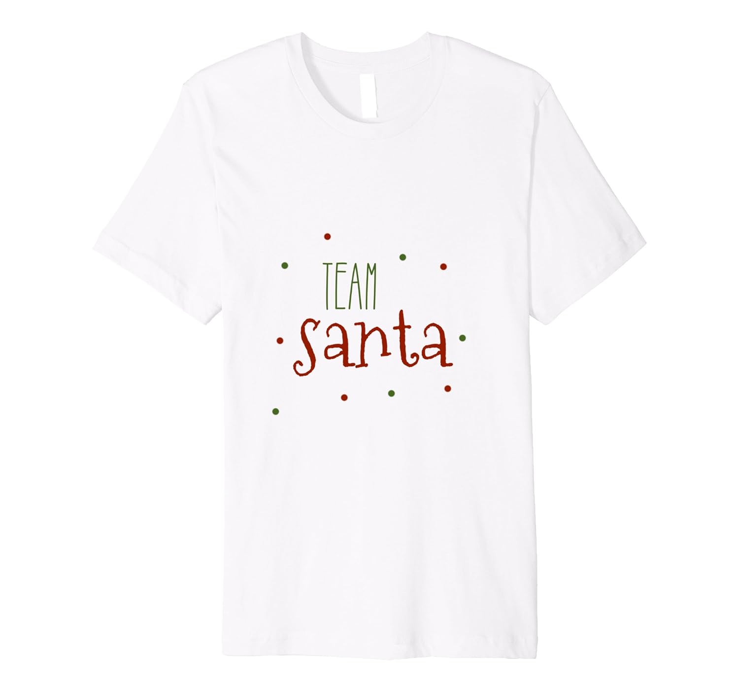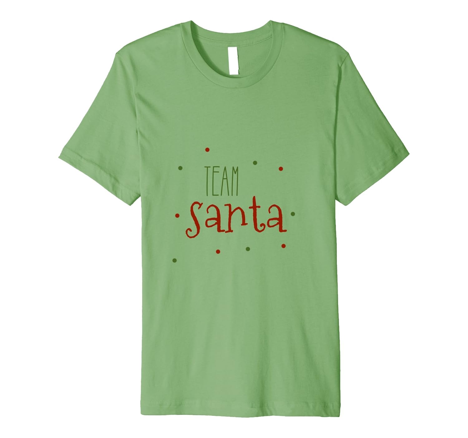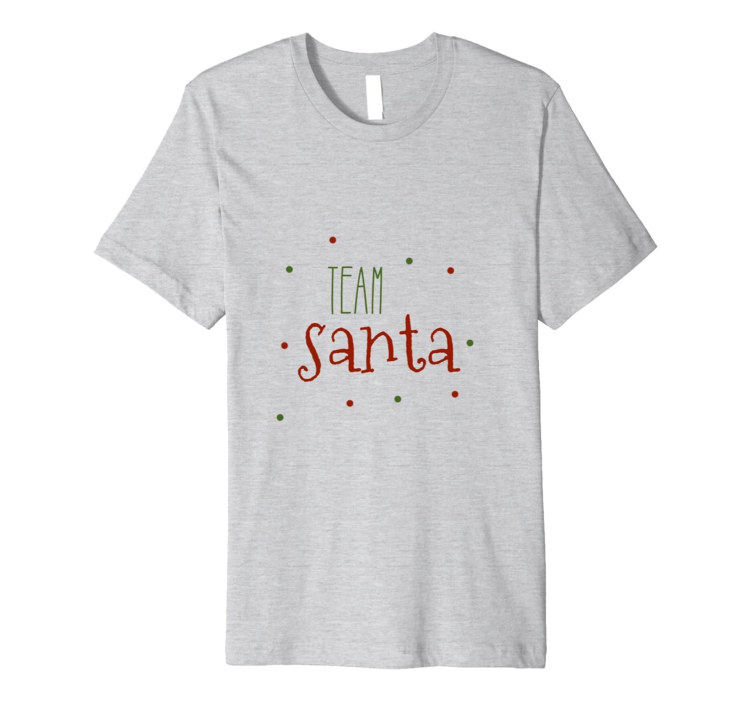 Solid colors: 100% Cotton; Heather Grey: 90% Cotton, 10% Polyester; All Other Heathers: 58% Cotton, 42% Polyester; Imported; Machine wash cold with like colors, dry low heat; This funny shirt for men or women reads team santa in a festive holiday font with decorative red and green confetti.; Fit: Slim (consider ordering a larger size for a looser fit); Present this tee as a gift to your christmas loving friends, family and kids. Or wear the top yourself during the xmas season, to holiday parties, and as part of your outfit throughout the year to display your love of the holidays.; This premium t-shirt is made of lightweight fine jersey fabric