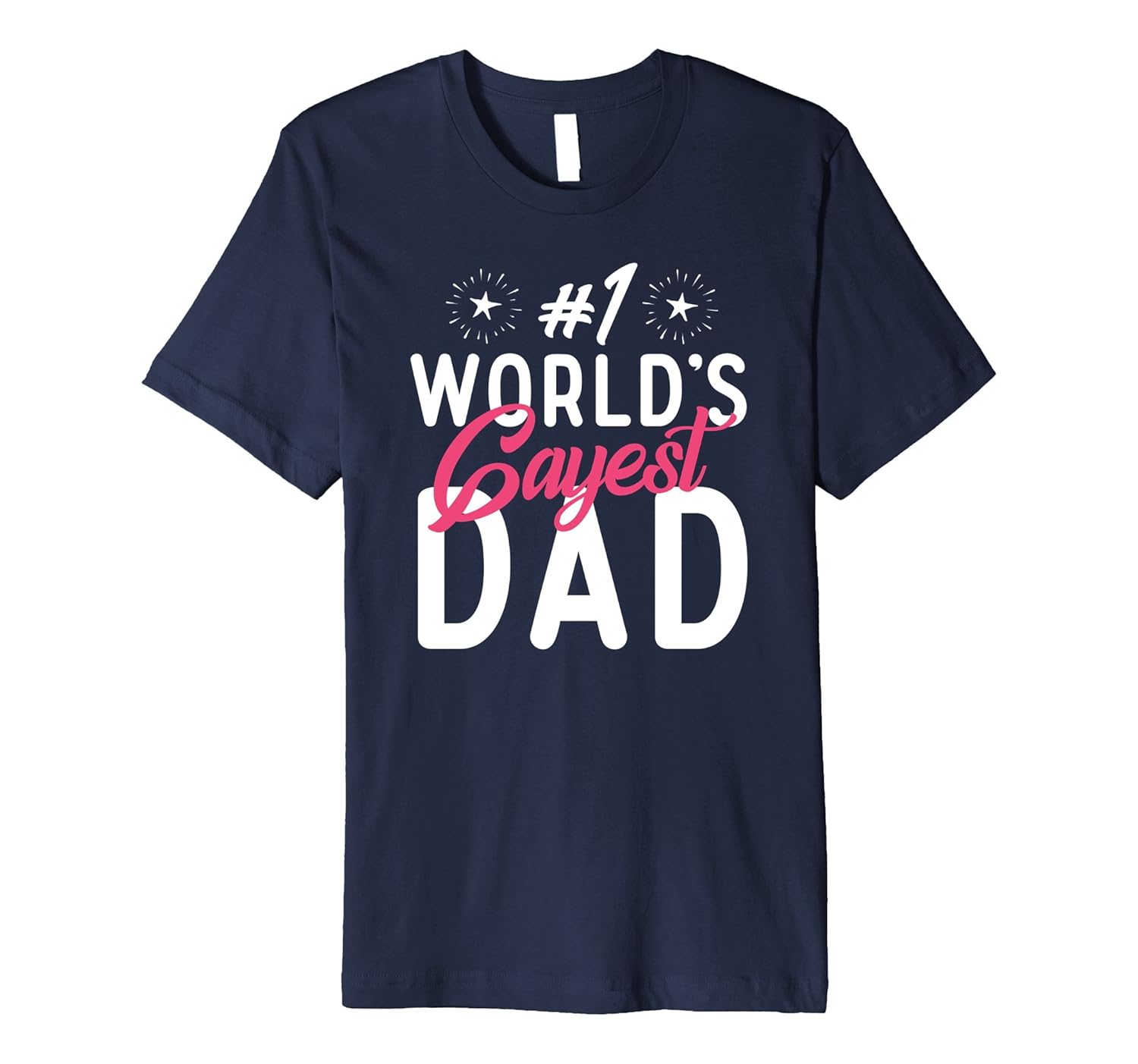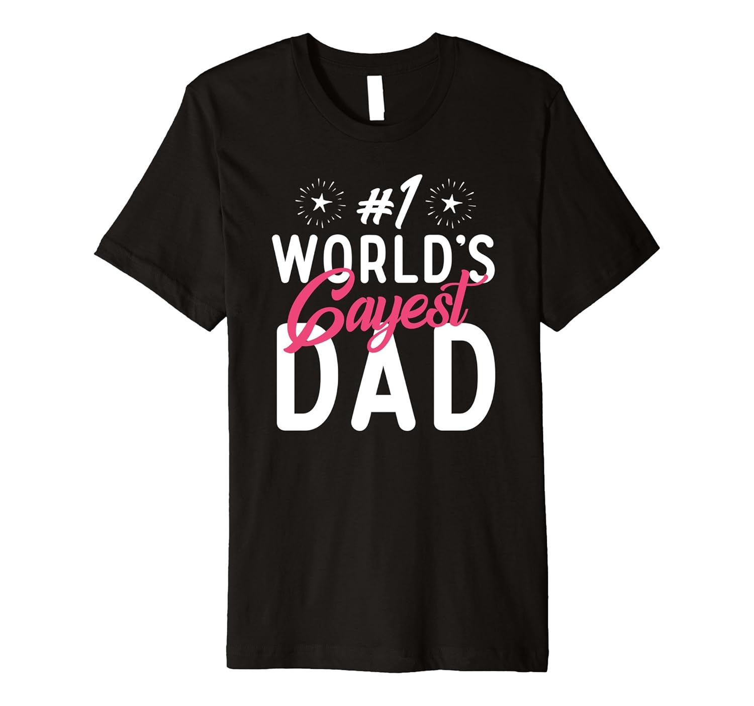 Solid colors: 100% Cotton; Heather Grey: 90% Cotton, 10% Polyester; All Other Heathers: 58% Cotton, 42% Polyester; Imported; Machine wash cold with like colors, dry low heat; This LGBT shirt is for the #1 Worlds Gayest Dad! Or Dads. But only one can really be the worlds gayest, right? Who needs to be worlds greatest dad when youre the worlds gayest! Show your dad that hes the gayest in your eyes with this heartwarming fathers day shirt design for the gay dad in your life. Hes number 1!; Fit: Slim (consider ordering a larger size for a looser fit); gay pride shirt, lgbt dad, queer dad, funny gay dad shirt, fathers day gift; This premium t-shirt is made of lightweight fine jersey fabric