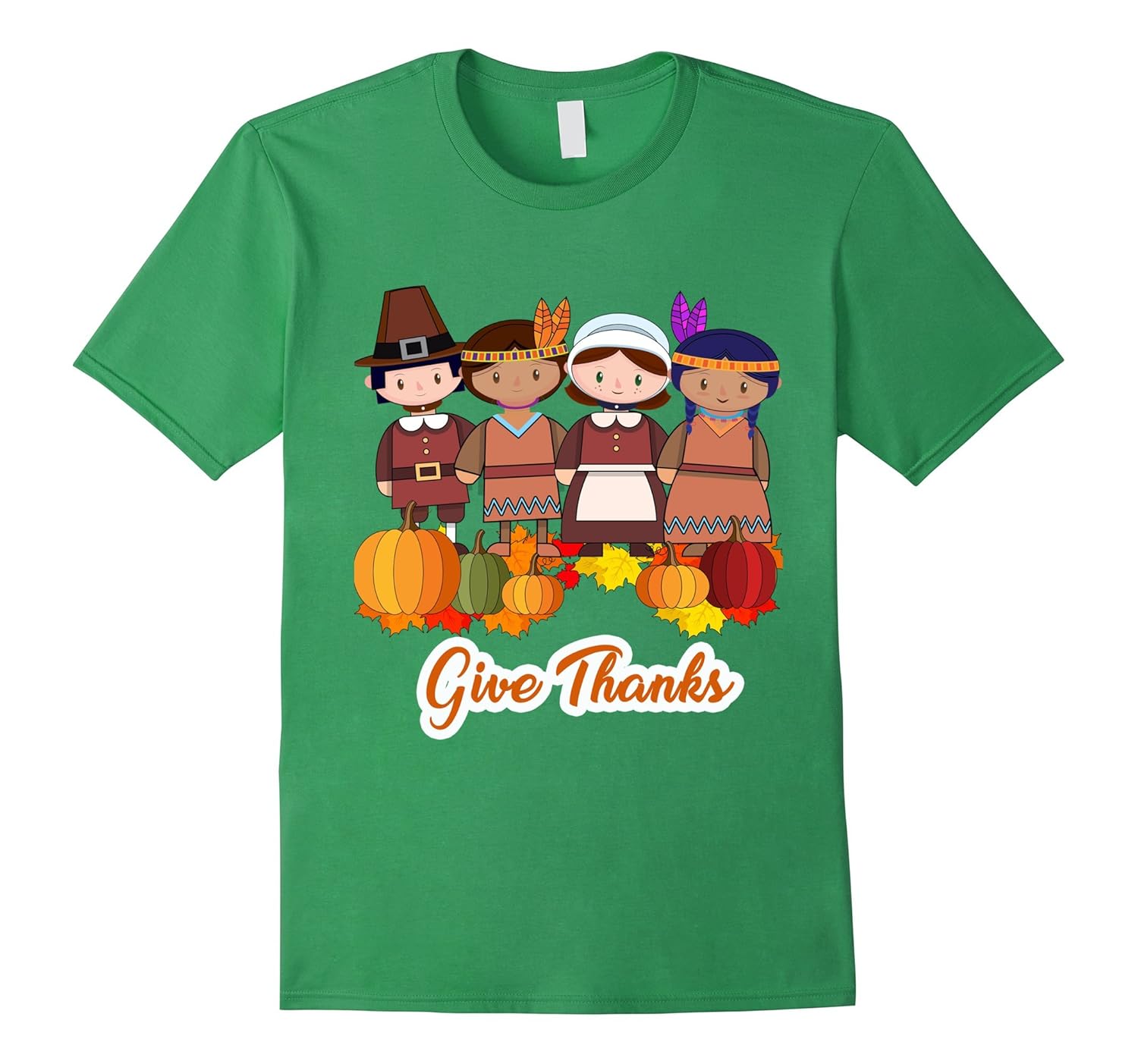 Solid colors: 100% Cotton; Heather Grey: 90% Cotton, 10% Polyester; All Other Heathers: 65% Cotton, 35% Polyester, Imported, Machine wash cold with like colors, dry low heat, Celebrate your blessings this Thanksgiving with this Give Thanks pumpkin t-shirt. Buy one today for yourself or as a gift for a loved one!, This Thanksgiving Pilgrim and Indian tee is designed and printed to be fitted. For a looser fit, please order a size up. Lightweight, Classic fit, Double-needle sleeve and bottom hem