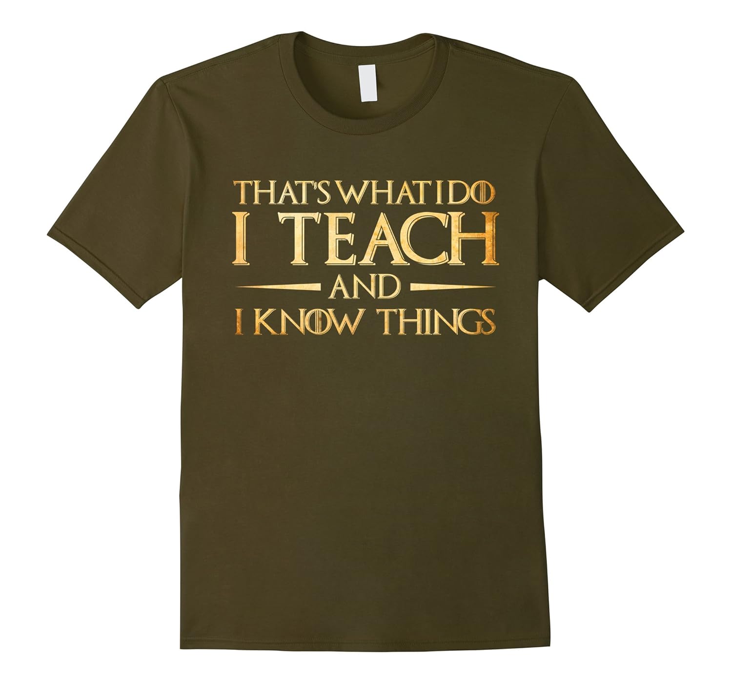 Solid colors: 100% Cotton; Heather Grey: 90% Cotton, 10% Polyester; All Other Heathers: 65% Cotton, 35% Polyester; Imported; Machine wash cold with like colors, dry low heat; Parody T-Shirt -Thats What I Do I Teach And I Know Things T-Shirt. Perfect idea gift for your teacher. Cool tee for your Dad, Mom at Fathers Day, Mothers Day or for your sons, daughters who were the cool teacher. Custom funny, humorous shirt with quotes; Shirt for Mothers Day, Fathers Day, Grandparent Day 2017. Shirt for teaching, Math, Chemistry, Biology teacher shirt, profession shirt. Perfect teacher gift for birthday.; Lightweight, Classic fit, Double-needle sleeve and bottom hem