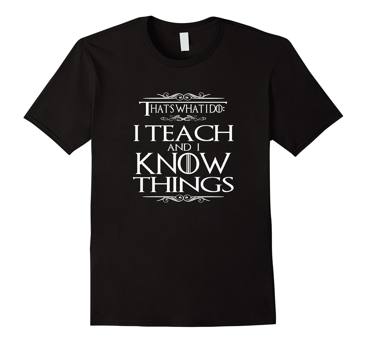 Solid colors: 100% Cotton; Heather Grey: 90% Cotton, 10% Polyester; All Other Heathers: 65% Cotton, 35% Polyester; Imported; Machine wash cold with like colors, dry low heat; Thats What I Do I Teach and I Know Things Funny Teacher t-shirt is designed and printed to be fitted. For a more loose fit, please order a size up.; Teachers arent playing games. They teach and they know things. Perfect gift for any teacher of english, music, art, history, science, math, elementary, middle school, high school teacher, or college professor.; Lightweight, Classic fit, Double-needle sleeve and bottom hem
