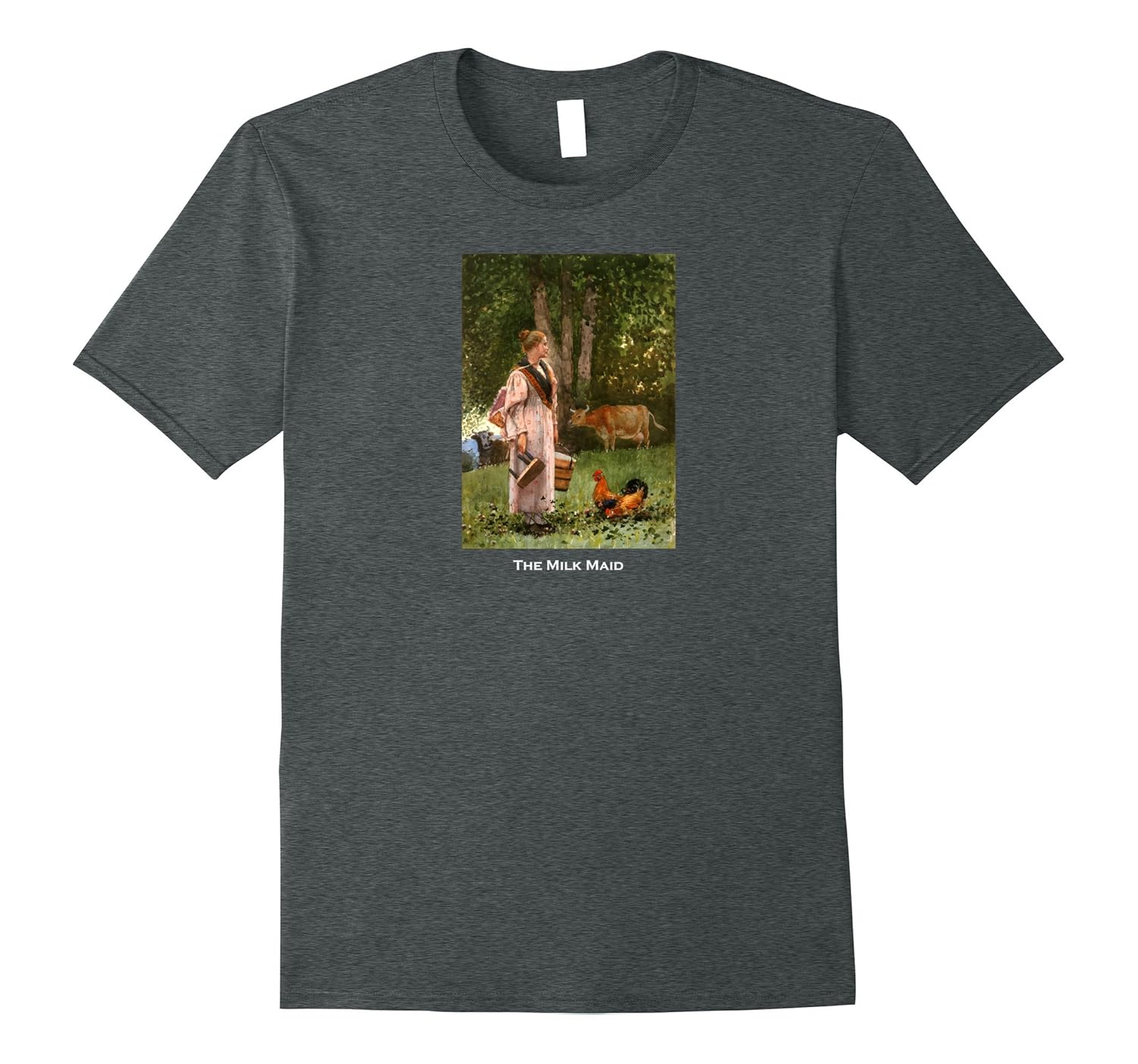Solid colors: 100% Cotton; Heather Grey: 90% Cotton, 10% Polyester; All Other Heathers: 65% Cotton, 35% Polyester, Imported, Machine wash cold with like colors, dry low heat, The image features a young woman Milk Maid carrying a milking stool and pail. Also in the grassy setting are several cows and a few chickens. Makes a great gift for those who enjoy farm animals, pastoral scenes and for art lovers. The Milk Maid T-shirt Image by Winslow Homer is a colorful country scene depicting farm life. For a relaxed fit, order one size larger. Lightweight, Classic fit, Double-needle sleeve and bottom hem