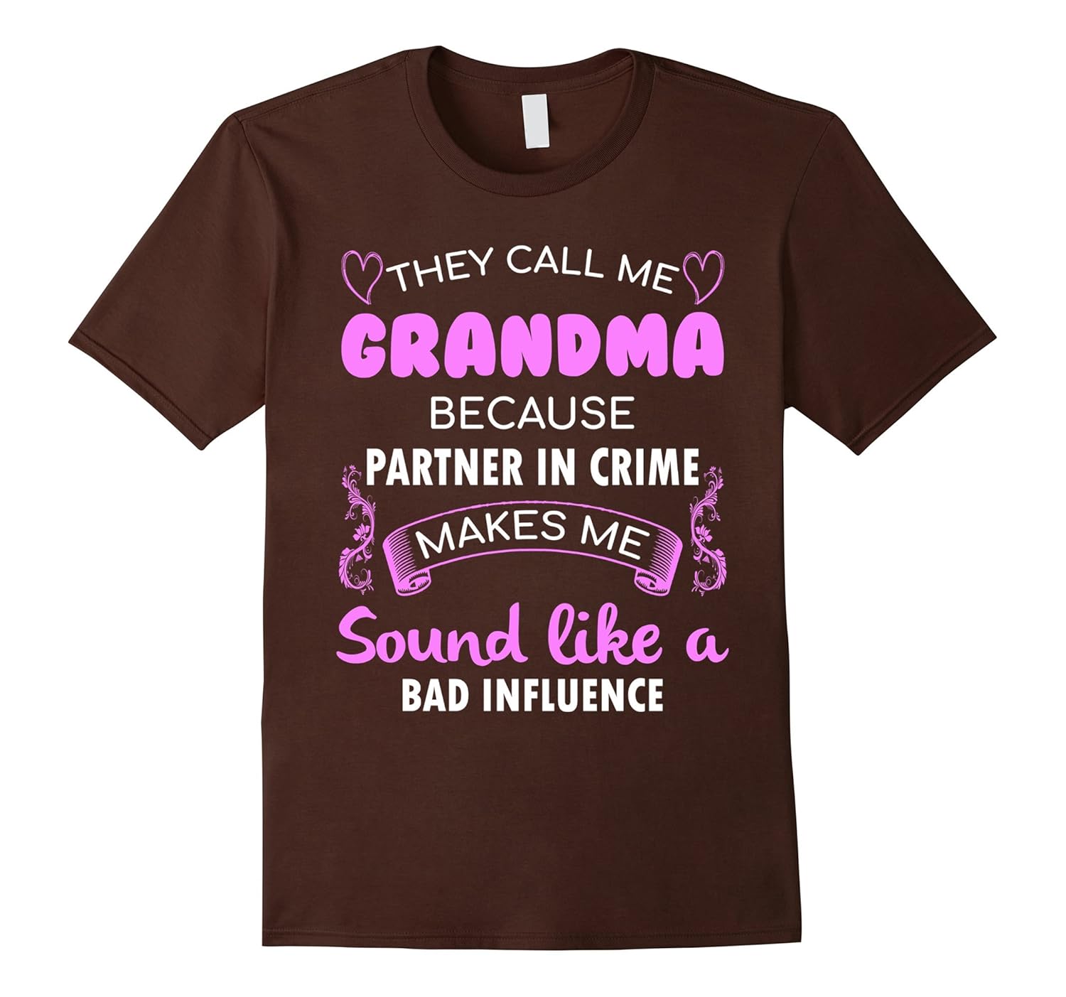 Solid colors: 100% Cotton; Heather Grey: 90% Cotton, 10% Polyester; All Other Heathers: 65% Cotton, 35% Polyester, Imported, Machine wash cold with like colors, dry low heat, They Call Me Grandma Because Partner In Crime Makes Me Sound Like A Bad Influence, Lightweight, Classic fit, Double-needle sleeve and bottom hem