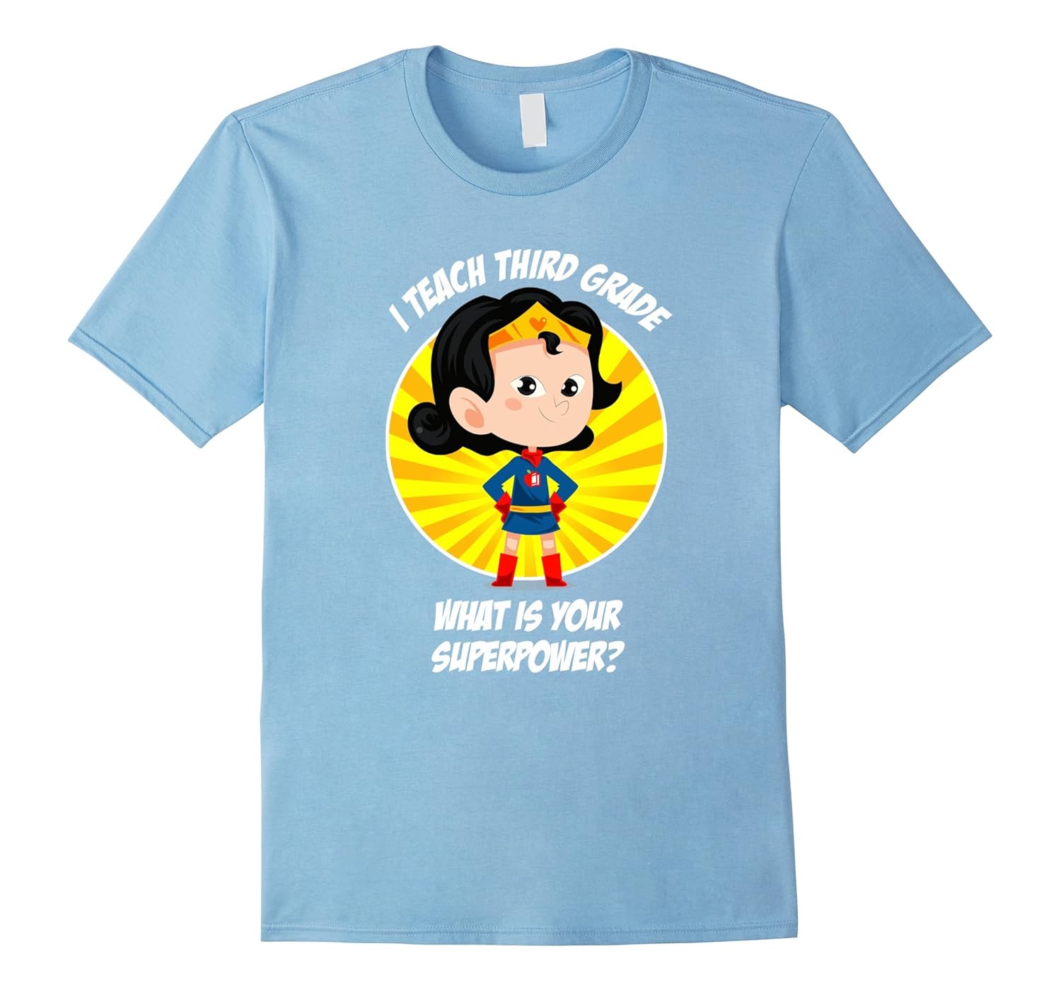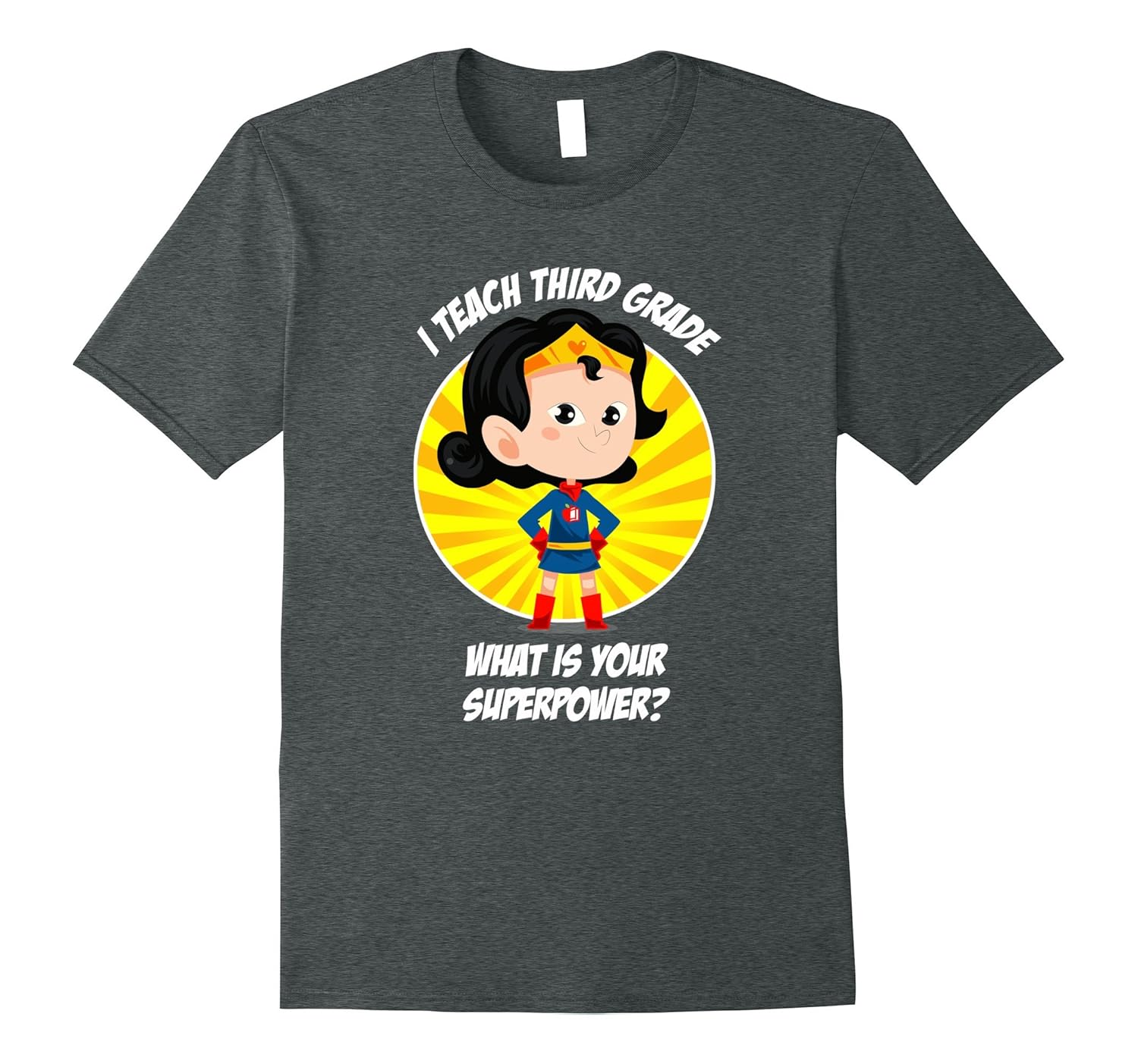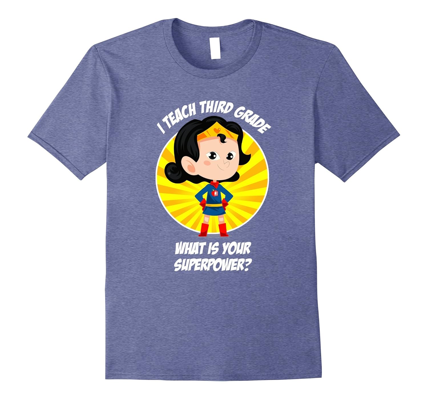 Solid colors: 100% Cotton; Heather Grey: 90% Cotton, 10% Polyester; All Other Heathers: 65% Cotton, 35% Polyester; Imported; Machine wash cold with like colors, dry low heat; This funny Third Grade Teacher Superpower T-Shirt is perfect for Teacher Appreciation Day, Mothers Day, Christmas, birthday or other special or school event. You will rule the school in this shirt!; This graphic tee features a cute superhero in a power pose in front of a sunburst! The graphic emblem on the chest is an apple and book symbol. Shirts are fitted. For a looser fit consider a larger size.; Lightweight, Classic fit, Double-needle sleeve and bottom hem