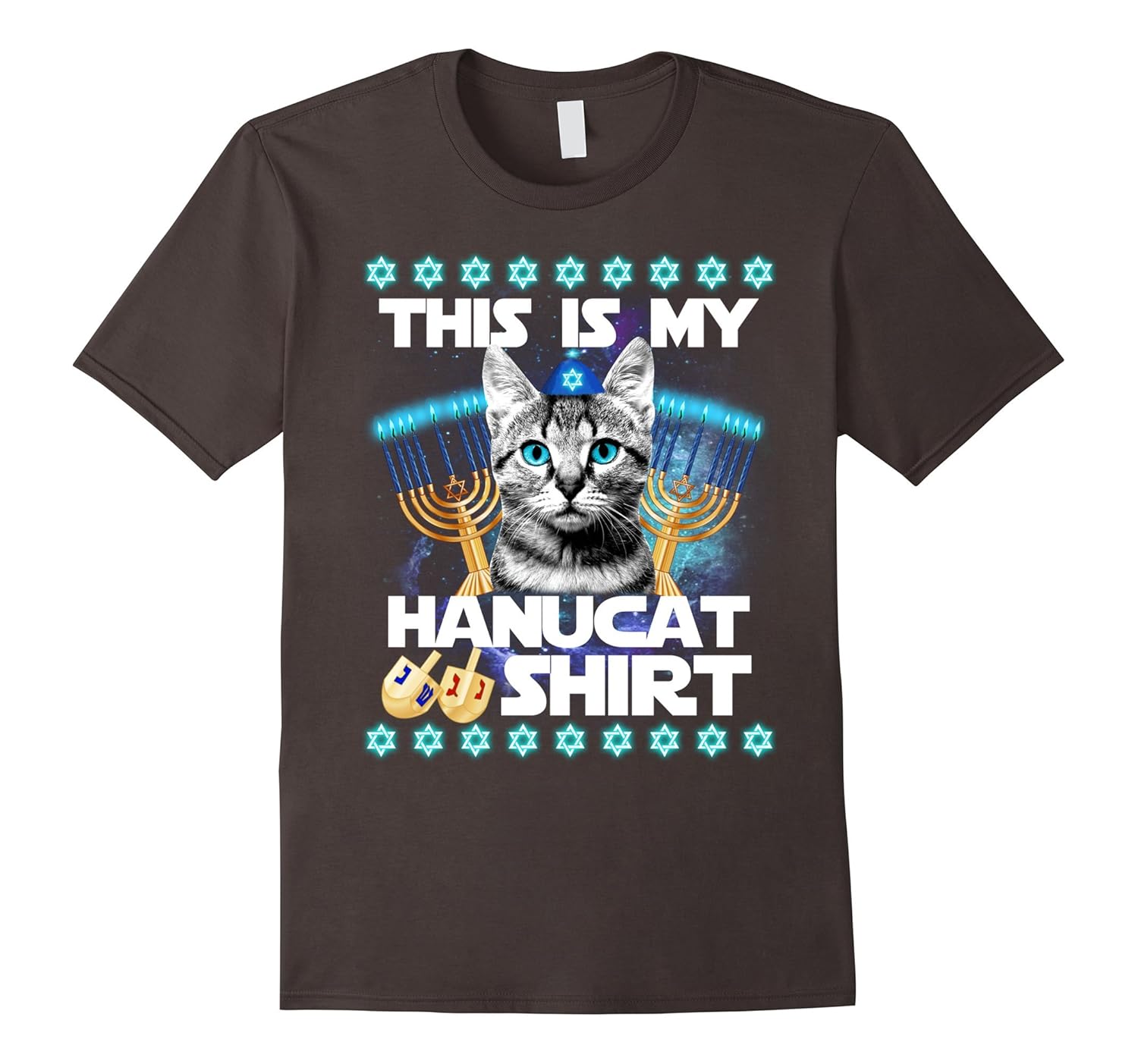 Solid colors: 100% Cotton; Heather Grey: 90% Cotton, 10% Polyester; All Other Heathers: 65% Cotton, 35% Polyester, Imported, Machine wash cold with like colors, dry low heat, Celebrate the Hanukkah holiday with funny This Is My Hanucat Shirt featuring a cute cat wearing yarmulke, dreidel and hold Hanukkah menorah. Hilarious Hanukkah costume t-shirt for cat lovers, cat parents, cat lady, cat, kitten, pet owner. Faux sweater knit design with Star of David, dreidel, galaxy and snowflakes graphics. Perfect for men, women, boys, girls, kids all ages. Wear it proudly to show your Hanukkah spirit. Lightweight, Classic fit, Double-needle sleeve and bottom hem