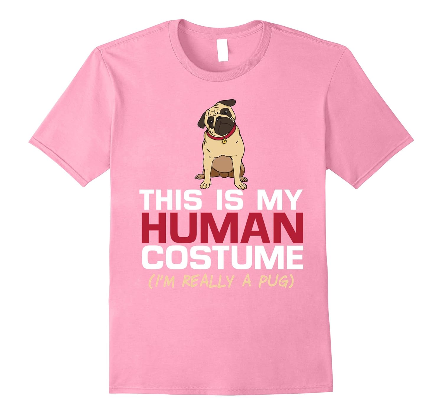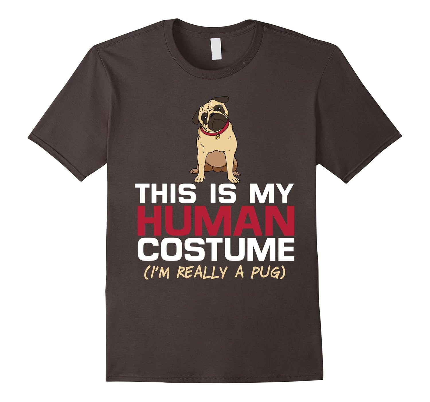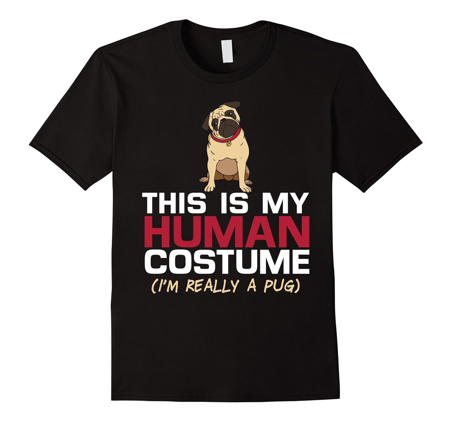 Solid colors: 100% Cotton; Heather Grey: 90% Cotton, 10% Polyester; All Other Heathers: 65% Cotton, 35% Polyester; Imported; Machine wash cold with like colors, dry low heat; This Is My Human Costume Im Really A Pug TShirt is designed to fit. For a looser fit order a size up.; THIS IS MY HUMAN COSTUME Im really a pug tee – funny last minute Halloween costume shirt, or great gift for the lover of pugs who has 10 dogs. If youre a pug lover, pug mom, or just plain love pugs get this cute pug costume tee.; Lightweight, Classic fit, Double-needle sleeve and bottom hem