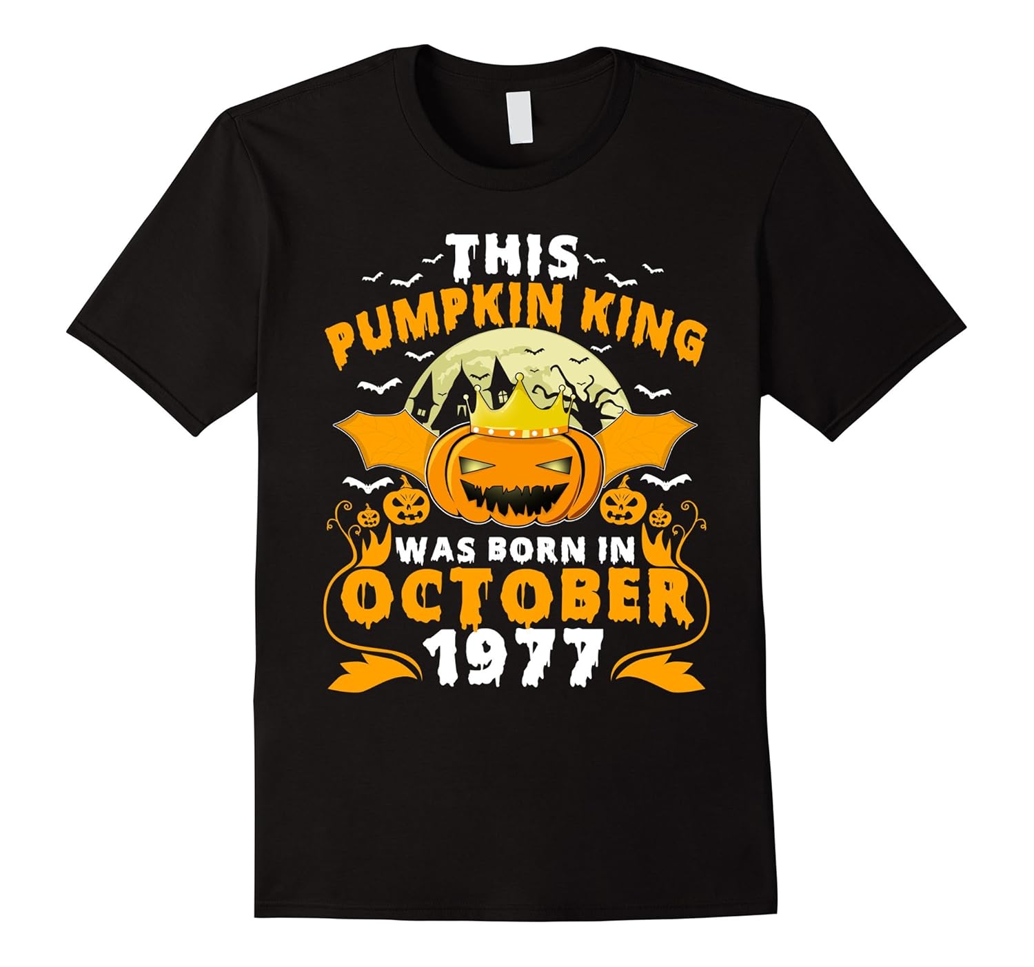 Solid colors: 100% Cotton; Heather Grey: 90% Cotton, 10% Polyester; All Other Heathers: 65% Cotton, 35% Polyester, Imported, Machine wash cold with like colors, dry low heat, Kings are in Oct 1977. 40th birthday gifts for a man who was born in 1977. October birth month T-shirt. Libra pride T-shirt is a great Halloween gift for your man. Halloween is my birthday T-shirt. 40 years old Halloween. Proud to be a king in 1977. Wear this Jack O” Lantern pumpkin lantern with bat T-shirt to a Halloween party, trick or treating, to a haunted house, or anytime during the fall. Let”s celebrate Halloween, dress up give out candy and get drunk in the night. Lightweight, Classic fit, Double-needle sleeve and bottom hem