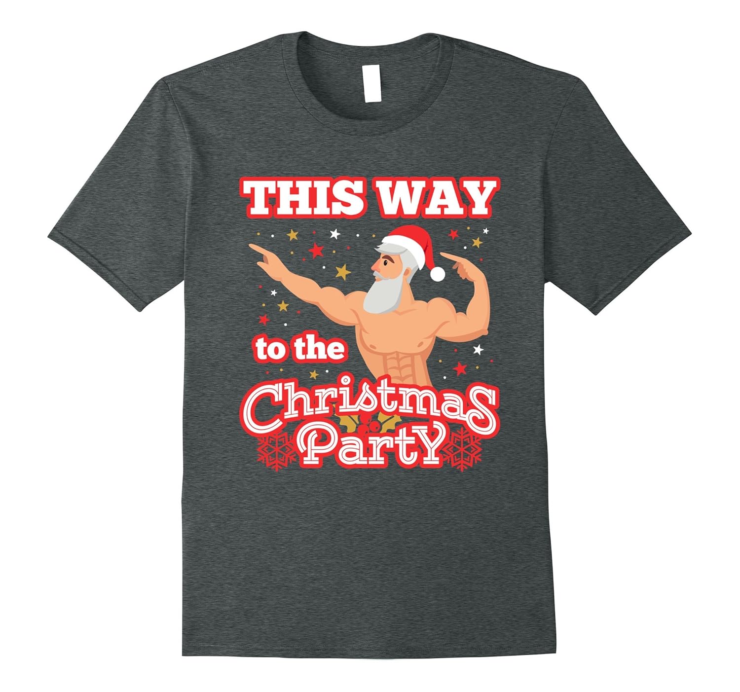 Solid colors: 100% Cotton; Heather Grey: 90% Cotton, 10% Polyester; All Other Heathers: 65% Cotton, 35% Polyester; Imported; Machine wash cold with like colors, dry low heat; Do you love Christmas, holiday spirit Andamp; Santa shirts? This This Way To The Xmas Party Santa Hat Andamp; Beard Muscle Xmas Tee Shirts for you. A great Christmas holiday season shirt in December for those who love Winter, Kris Kringle, elf, and weight lifting.; Shirts shrink in the wash, please order one size up for a true fit. If you like six pack, sled, reindeer, egg nog,, candy cane, mistletoe, tree, then you will love this tshirt. A great festive, snow, bodybuilding, muscleman, flexing, shirtless, abs shirt; Lightweight, Classic fit, Double-needle sleeve and bottom hem