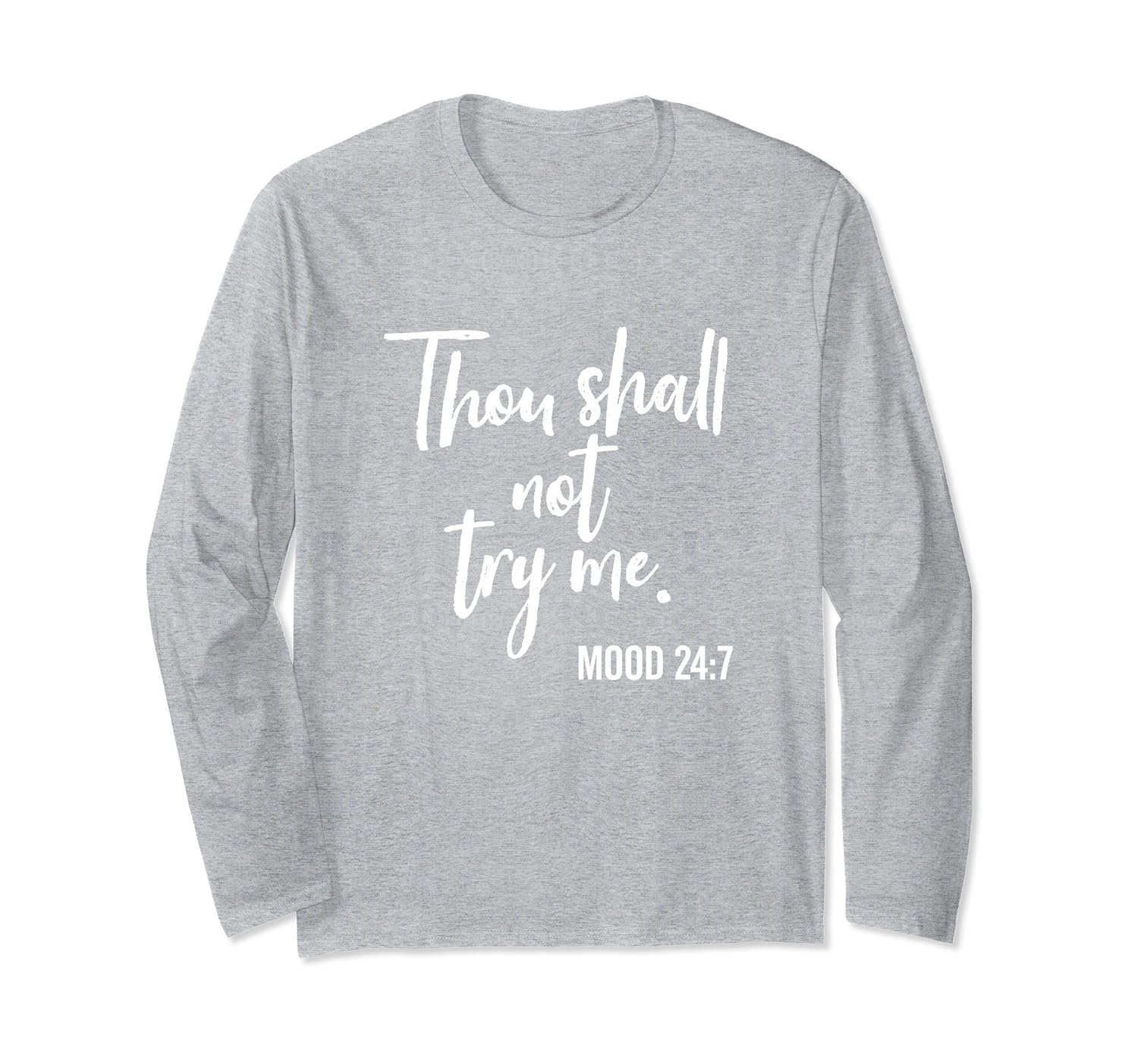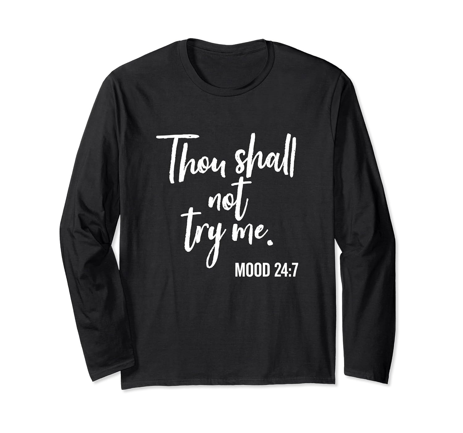 Solid colors: 100% Cotton; Heather Grey: 90% Cotton, 10% Polyester; All Other Heathers: 50% Cotton, 50% Polyester; Imported; Machine wash cold with like colors, dry low heat; Perfect for boys Andamp; girls who who love funny sayings. It says, thou shall not try me. Add this to your Christmas and birthday gift ideas.; Wear it proudly to school or with friends. Makes a great present for those who are in a mood 24 hours a day 7 days a week.; Lightweight, Classic fit, Double-needle sleeve and bottom hem
