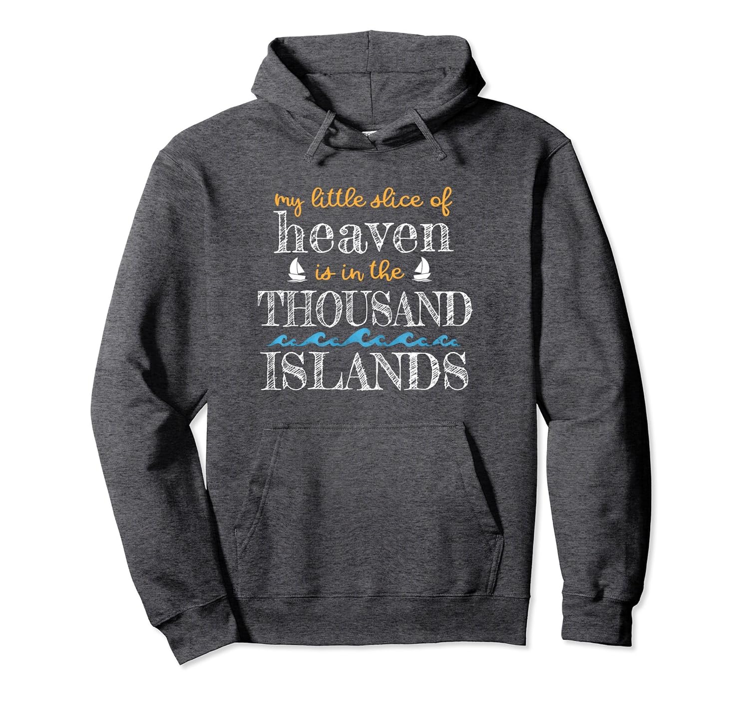 Solid colors: 80% Cotton, 20% Polyester; Heather Grey: 78% Cotton, 22% Poly; Dark Heather: 50% Cotton, 50% Polyester; Imported; Machine wash cold with like colors, dry low heat; This Thousand Islands Hooded Sweatshirt says My Slice of Heaven is in the Thousand Islands. Makes a great gift for birthdays or holidays.; The 1000 Islands area is some of the most beautiful in the country. This hoodie makes a terrific birthday or holiday gift for anyone who enjoys spending time in the on the St. Lawrance River; 8.5 oz, Classic fit, Twill-taped neck