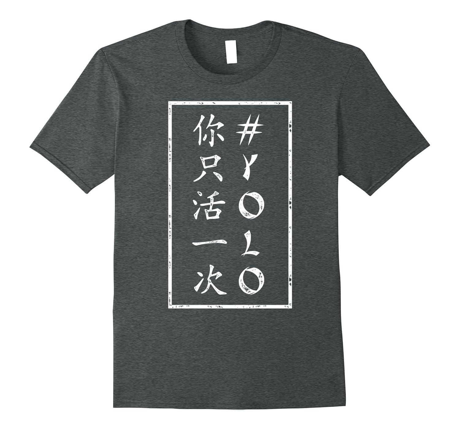 Solid colors: 100% Cotton; Heather Grey: 90% Cotton, 10% Polyester; All Other Heathers: 65% Cotton, 35% Polyester, Imported, Machine wash cold with like colors, dry low heat, This YOLO Chinese calligraphy shirt combines the word YOLO with its corresponding Chinese or Japanese Kanji characters. This Chinese character shirt brings Asian and American culture together in a distressed, novelty tee that will delight risk takers. This YOLO T-shirt with Chinese characters is fitted. For a looser fit, please order a size larger than typical. This Kanji shirt is perfect birthday gift or Christmas gift for men, women boys or girls who love living life and China or Japan. Lightweight, Classic fit, Double-needle sleeve and bottom hem