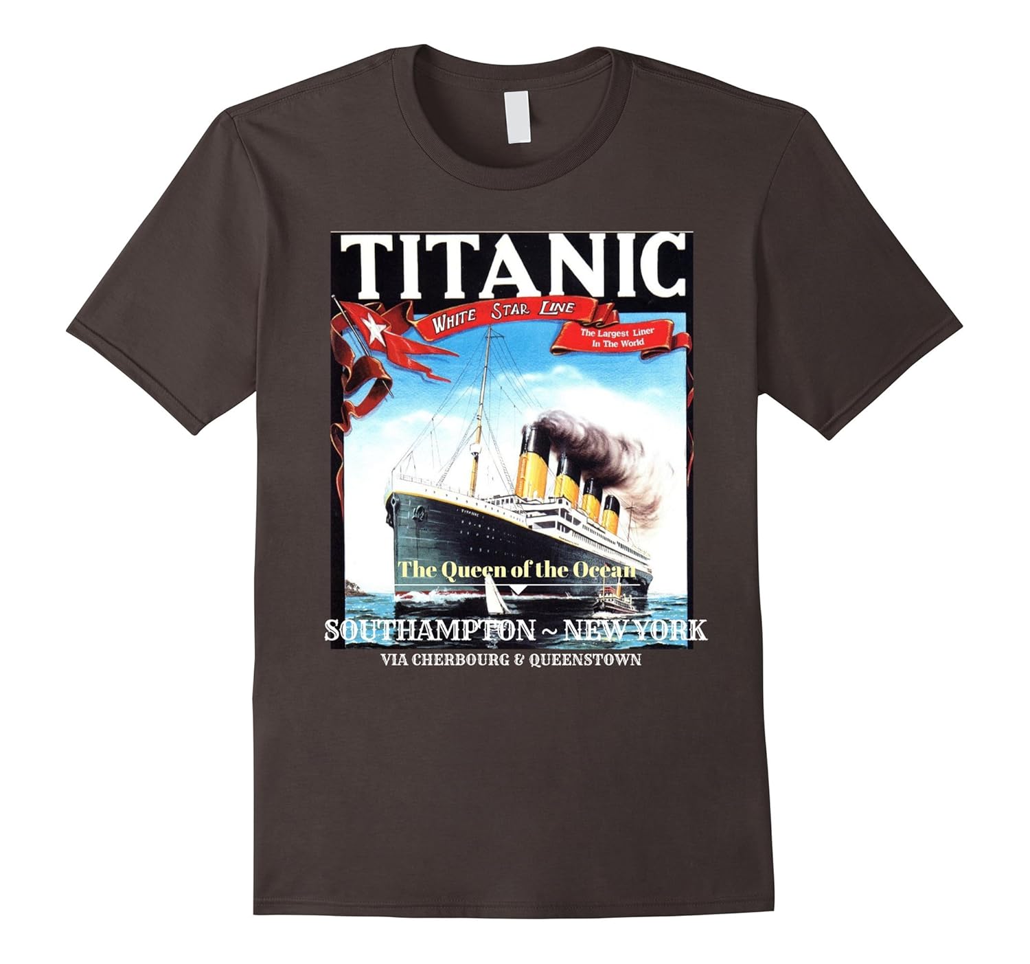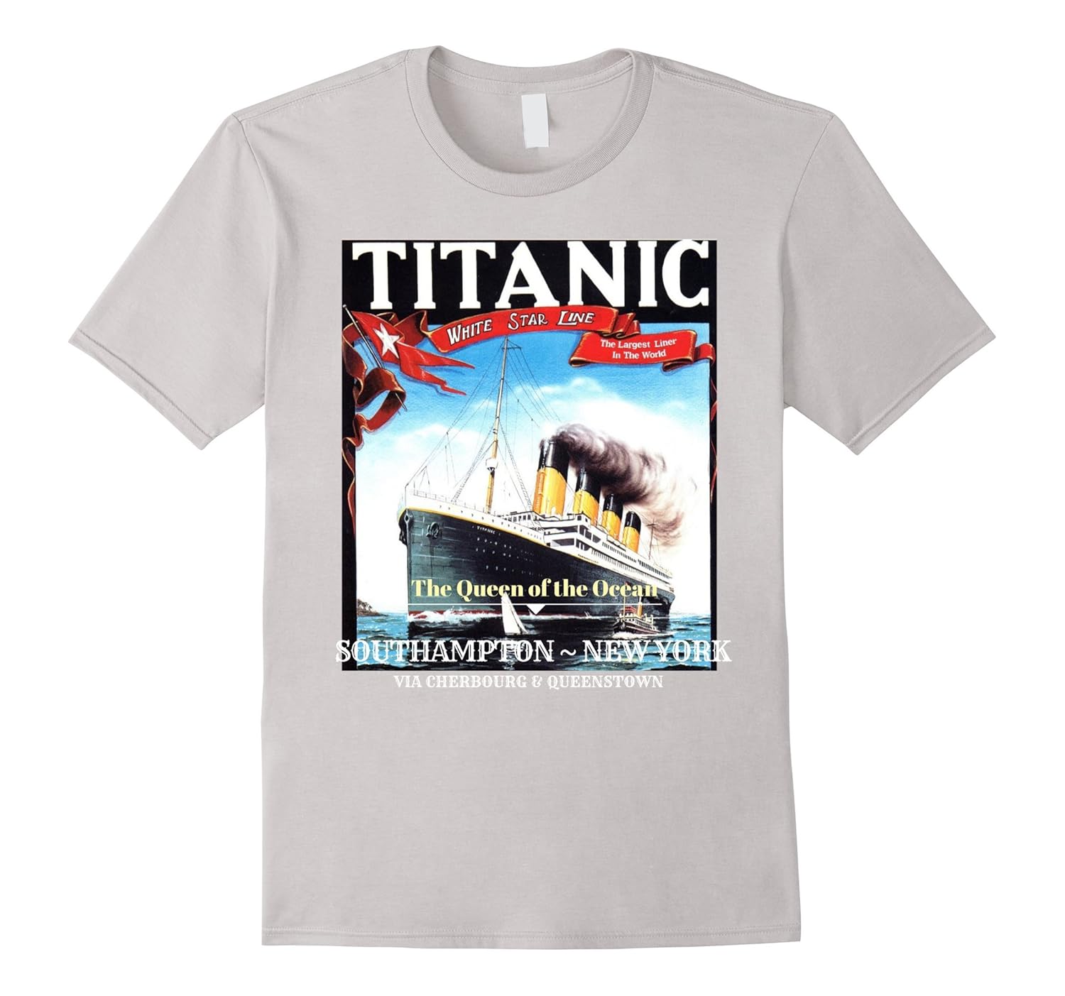 Solid colors: 100% Cotton; Heather Grey: 90% Cotton, 10% Polyester; All Other Heathers: 65% Cotton, 35% Polyester, Imported, Machine wash cold with like colors, dry low heat, Vintage graphic tee depicting a reimagining of an ad for the maiden voyage of the Titanic from Southampton to New York City cross a section of the Atlantic. Relive one of the most infamous maritime disasters of all times – the demise of the unsinkable ship, Titanic Queen of the Ocean Vintage Graphic T-Shirt – for history aficionados, explorers, treasury hunters, people into sailing, marine life, sunken ships, scuba diving, oceanography, geography, film trivia, and everyone interested in that fateful in 1912. Lightweight, Classic fit, Double-needle sleeve and bottom hem