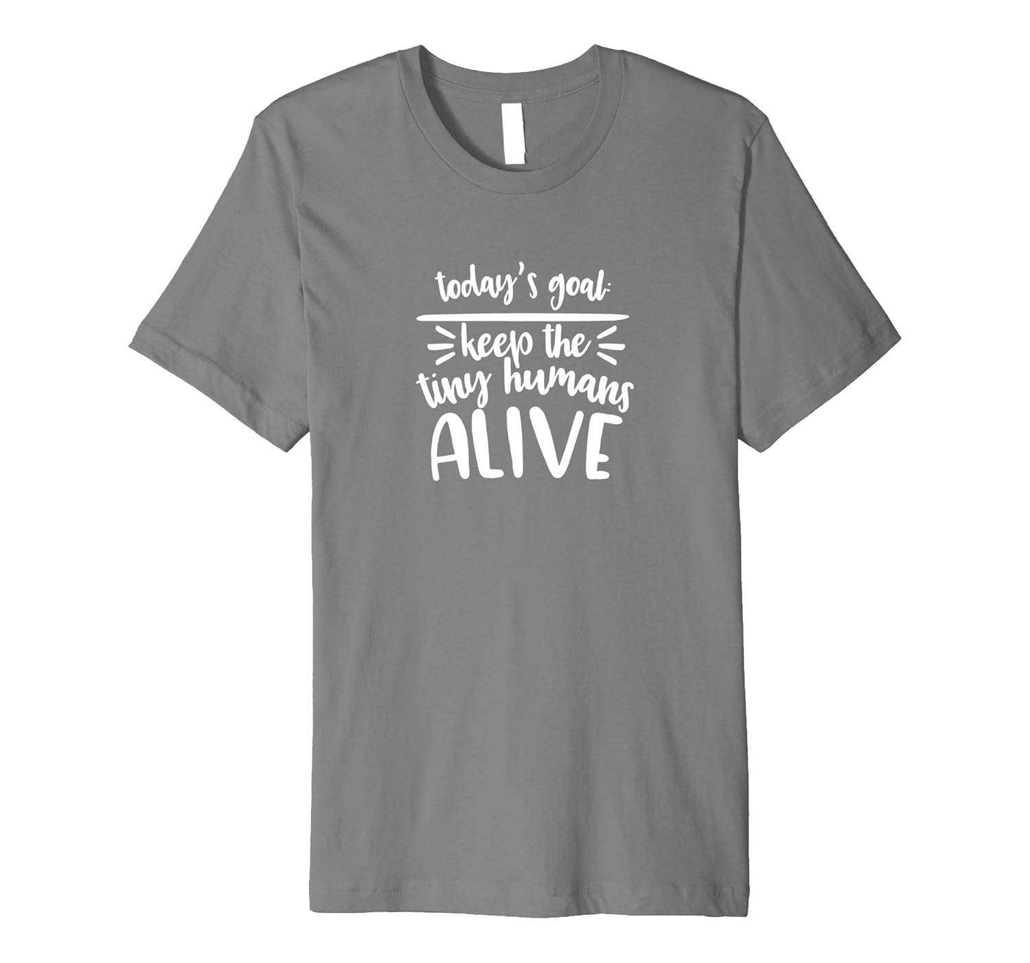 Solid colors: 100% Cotton; Heather Grey: 90% Cotton, 10% Polyester; All Other Heathers: 58% Cotton, 42% Polyester; Imported; Machine wash cold with like colors, dry low heat; Every parent needs to have a daily goal in order to survive living with their children. The goal for today is to keep those tiny humans alive.; Fit: Slim (consider ordering a larger size for a looser fit); This tee shirt would make a wonderful gift for Christmas, or Birthday for that new mom, dad, mother, father, or person you know who is trying to survive living with their new baby, infant or toddler.; This premium t-shirt is made of lightweight fine jersey fabric