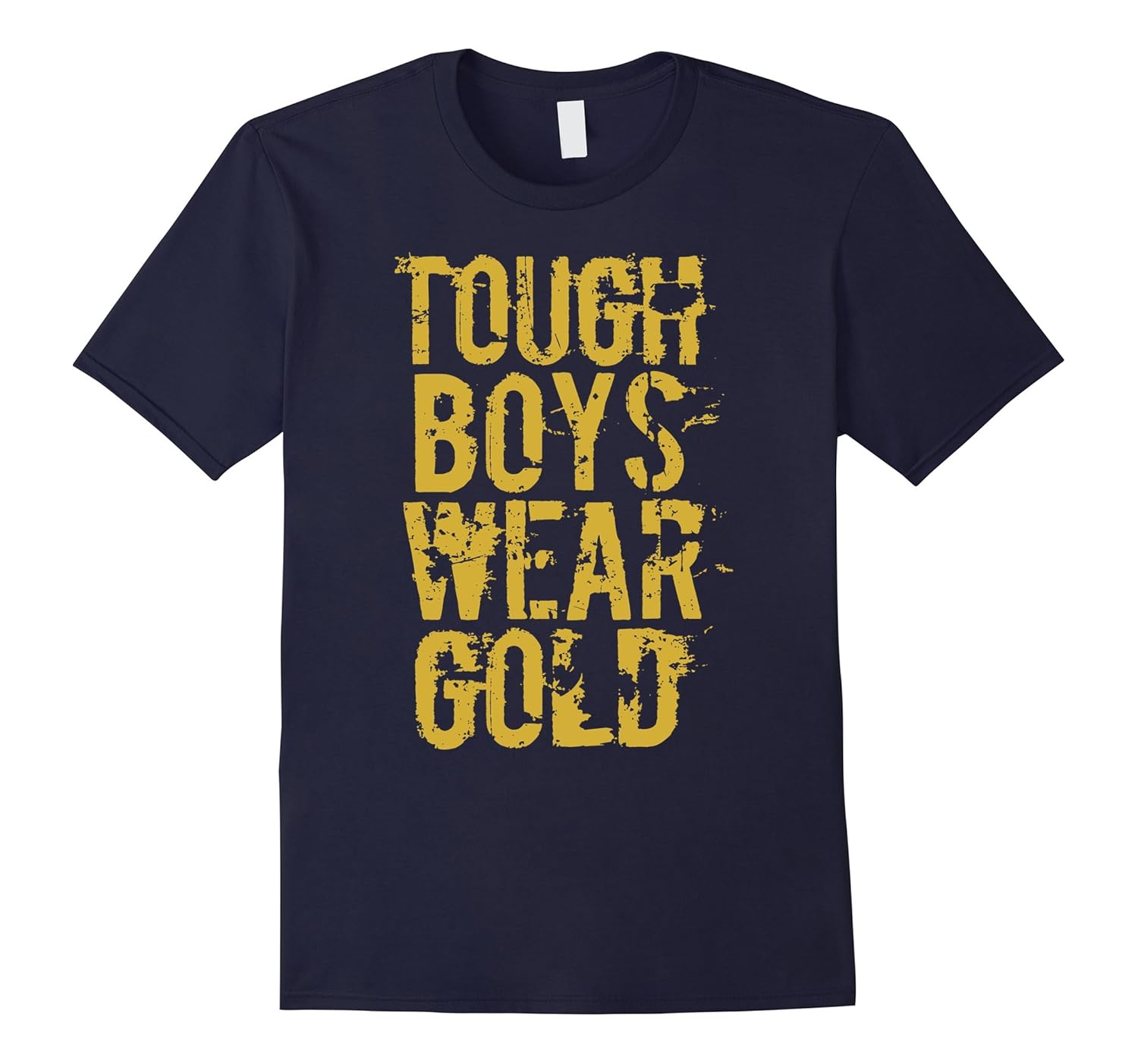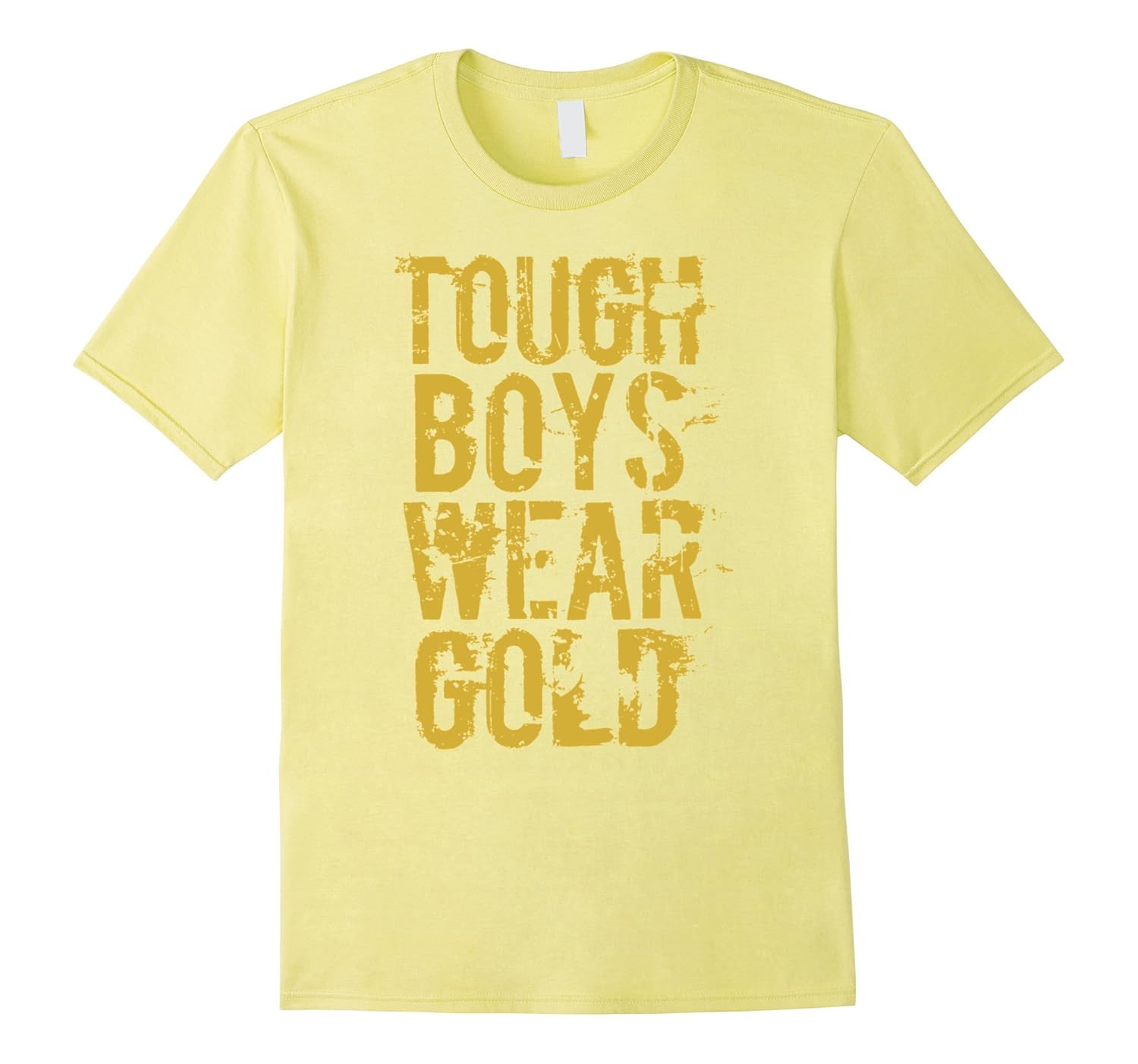 Solid colors: 100% Cotton; Heather Grey: 90% Cotton, 10% Polyester; All Other Heathers: 65% Cotton, 35% Polyester, Imported, Machine wash cold with like colors, dry low heat, Tough Boys Wear Gold T Shirt by Tough Kids Wear Gold Apparel, Great t shirt for any tough kid or adult to wear! Help raise awareness for childhood cancer with this gold text t shirt!, Lightweight, Classic fit, Double-needle sleeve and bottom hem