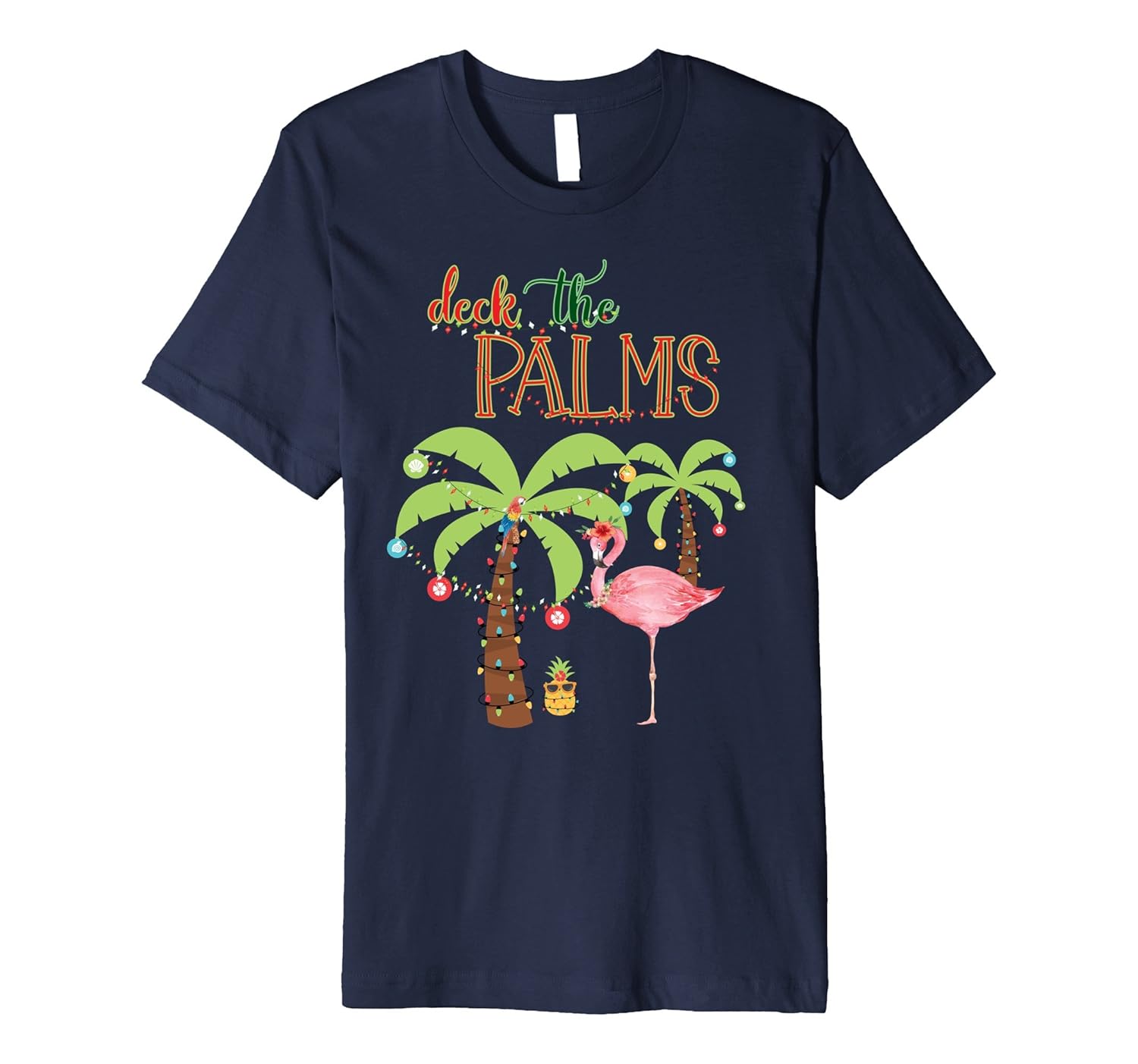Solid colors: 100% Cotton; Heather Grey: 90% Cotton, 10% Polyester; All Other Heathers: 58% Cotton, 42% Polyester; Imported; Machine wash cold with like colors, dry low heat; Deck The Palms in the Tropics Christmas T Shirt. Family Christmas vacation shirt with a pink flamingo.; Fit: Slim (consider ordering a larger size for a looser fit); Coconut Palms are all lit up with Christmas tree lights in this fun Tropical Christmas T shirt. Get one for each member of the family.; This premium t-shirt is made of lightweight fine jersey fabric