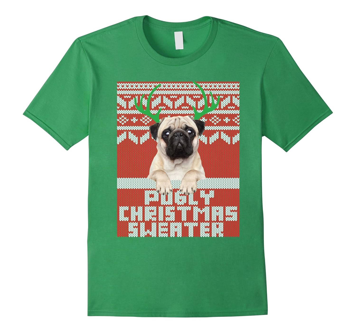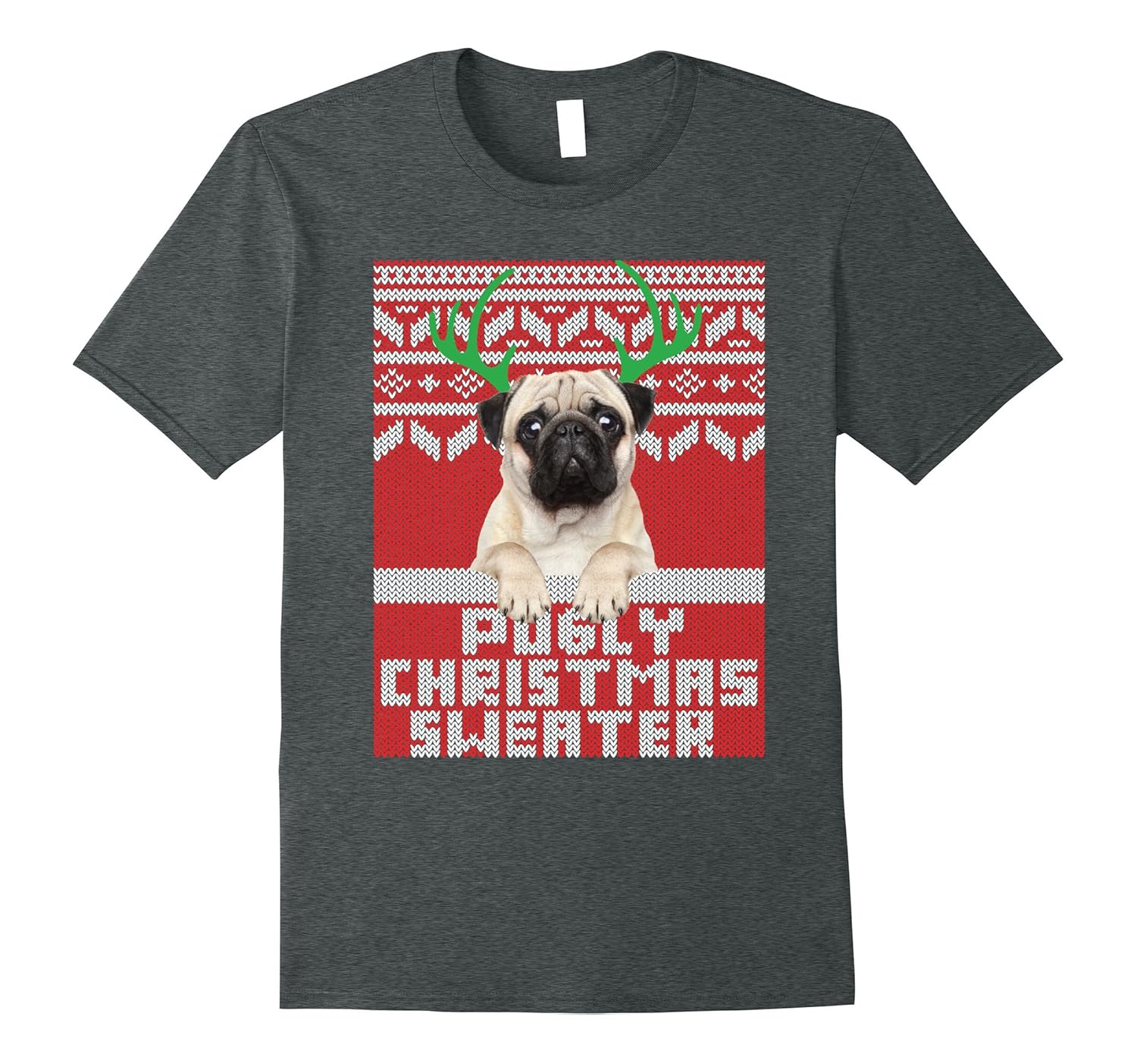 Solid colors: 100% Cotton; Heather Grey: 90% Cotton, 10% Polyester; All Other Heathers: 65% Cotton, 35% Polyester; Imported; Machine wash cold with like colors, dry low heat; Pugly Christmas Sweater T Shirt with cute pug puppy. Are you a Pug lover. Cute and adorable Pug Xmas shirt. Makes great gift!; Cute Pug with antlers t-shirt. Pug christmas tee shirt. This cute pug shirt is great for the holidays.; Lightweight, Classic fit, Double-needle sleeve and bottom hem