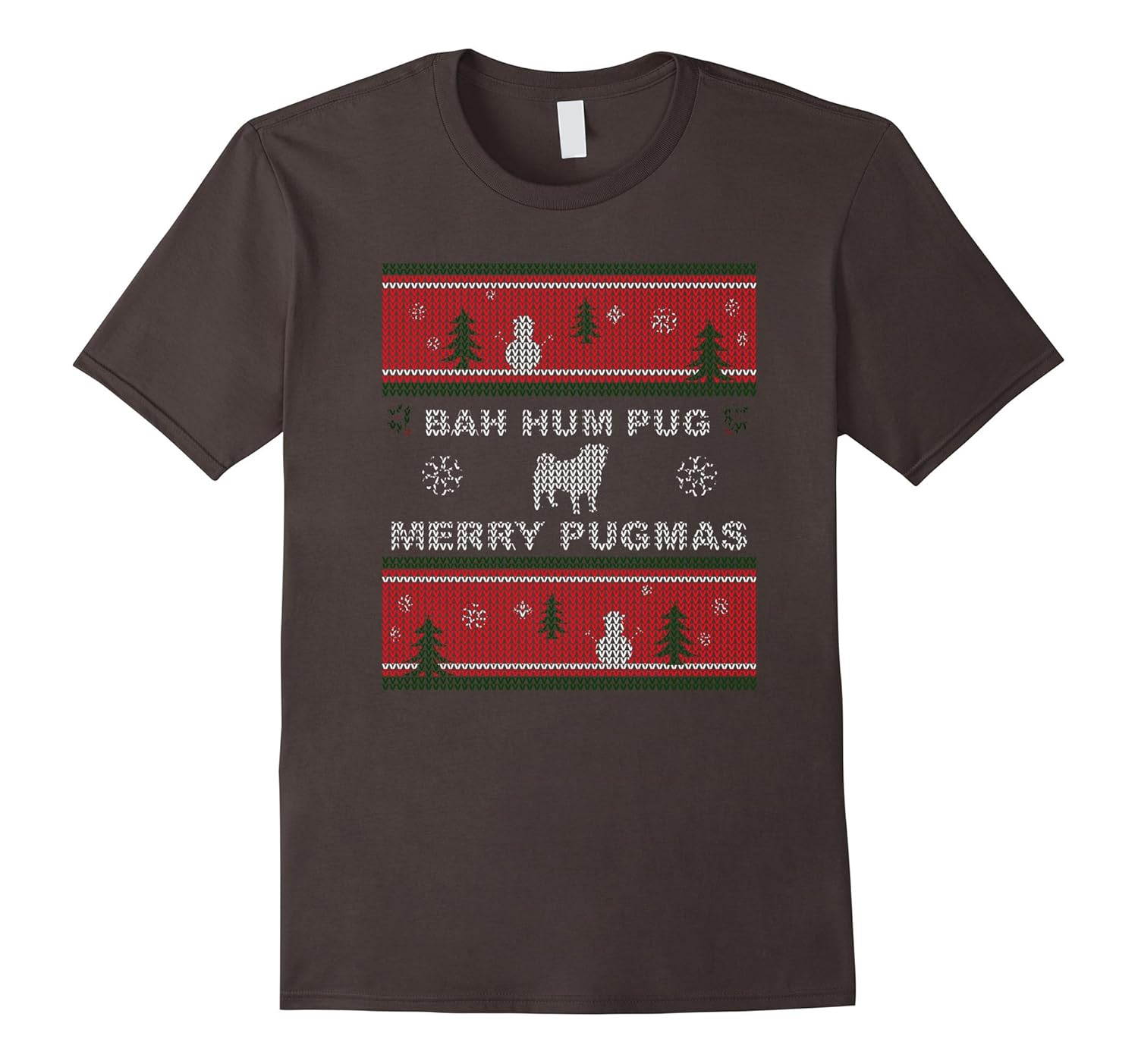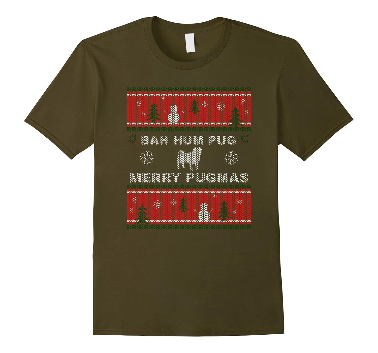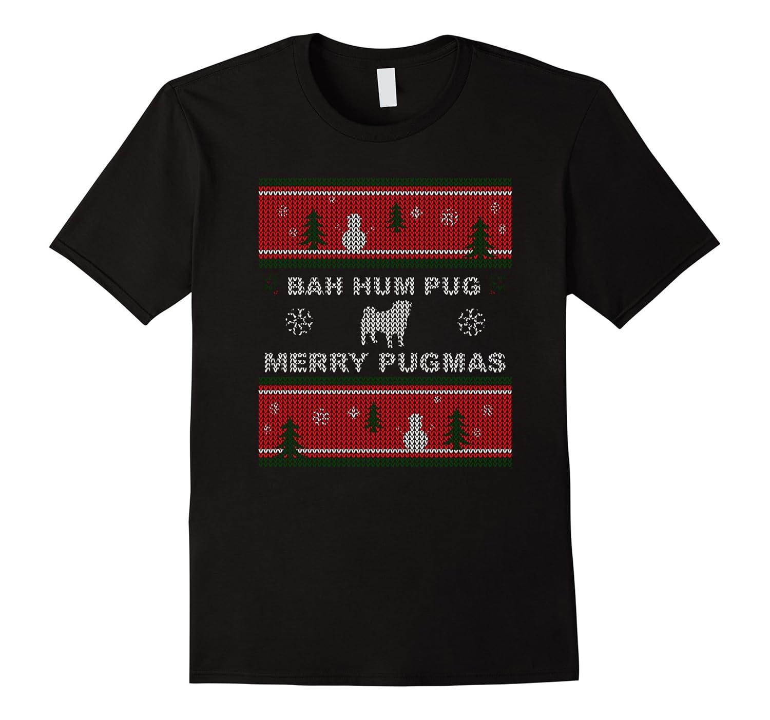 Solid colors: 100% Cotton; Heather Grey: 90% Cotton, 10% Polyester; All Other Heathers: 65% Cotton, 35% Polyester; Imported; Machine wash cold with like colors, dry low heat; Bah hum-pug! Merry Pug-mas!; Do you love pug dogs? Youd love this funny Christmas t-shirt with an ugly sweaters theme, depicting a pug puppy playing in the snow.; Lightweight, Classic fit, Double-needle sleeve and bottom hem