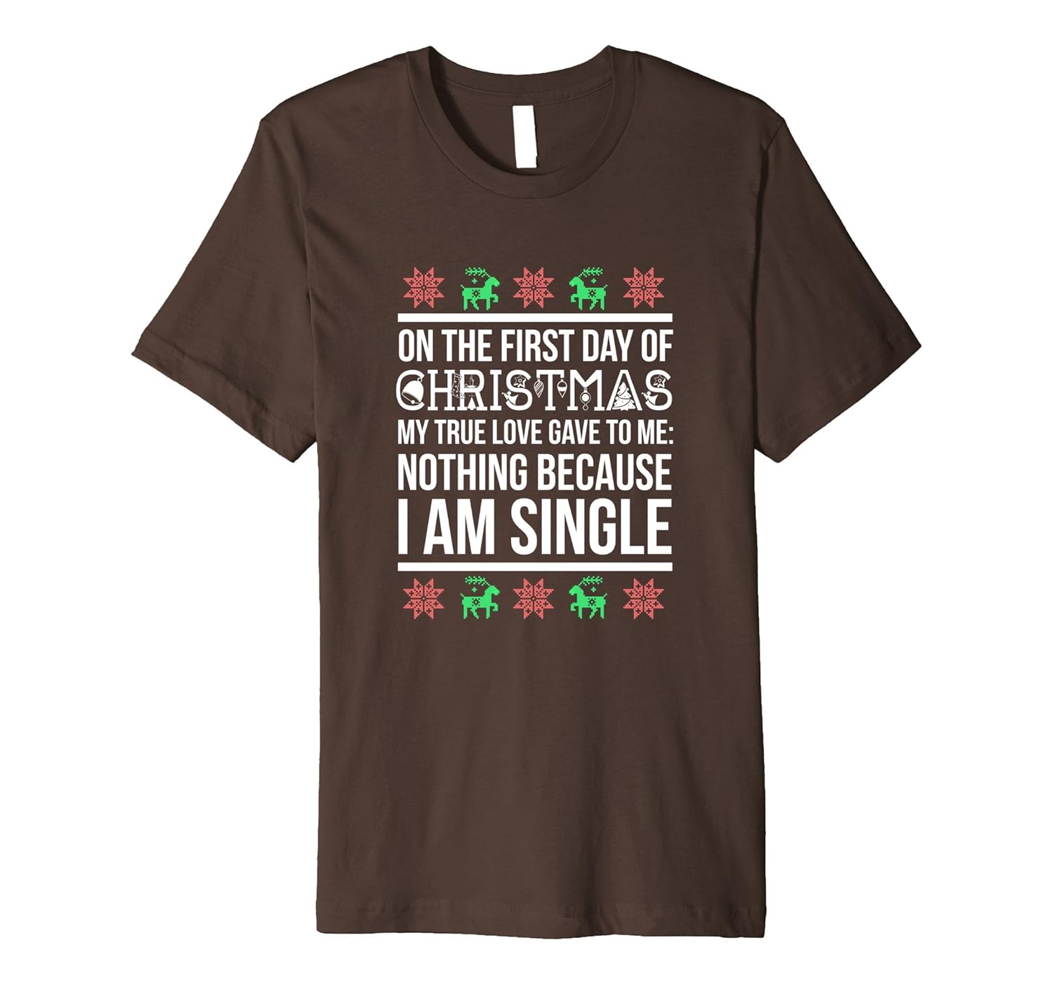 Solid colors: 100% Cotton; Heather Grey: 90% Cotton, 10% Polyester; All Other Heathers: 58% Cotton, 42% Polyester; Imported; Machine wash cold with like colors, dry low heat; On the first day of Christmas my true love gave me nothing because I am single.; Fit: Slim (consider ordering a larger size for a looser fit); Being single during the holidays means that you dont have to buy a lot of presents.; This premium t-shirt is made of lightweight fine jersey fabric