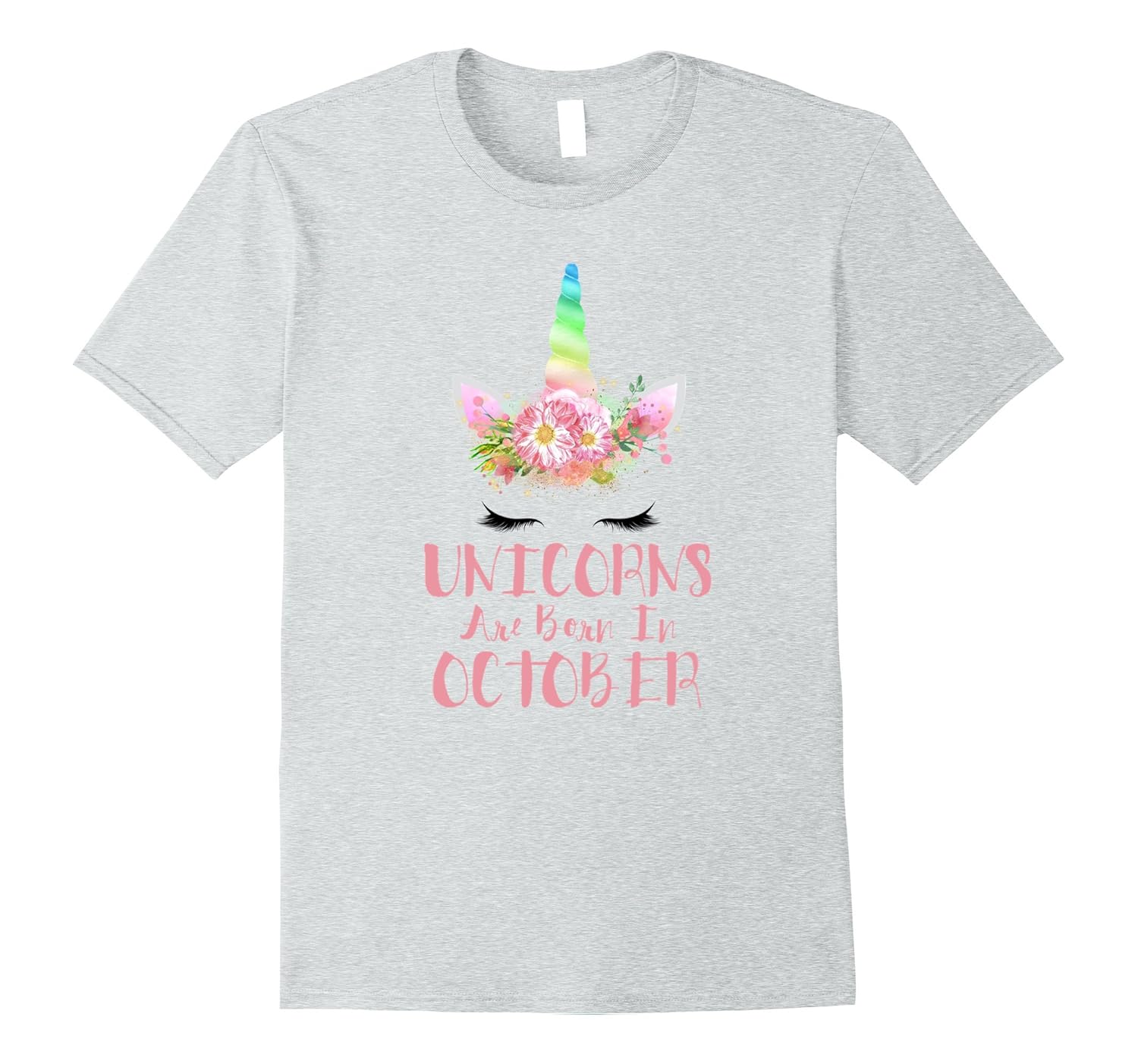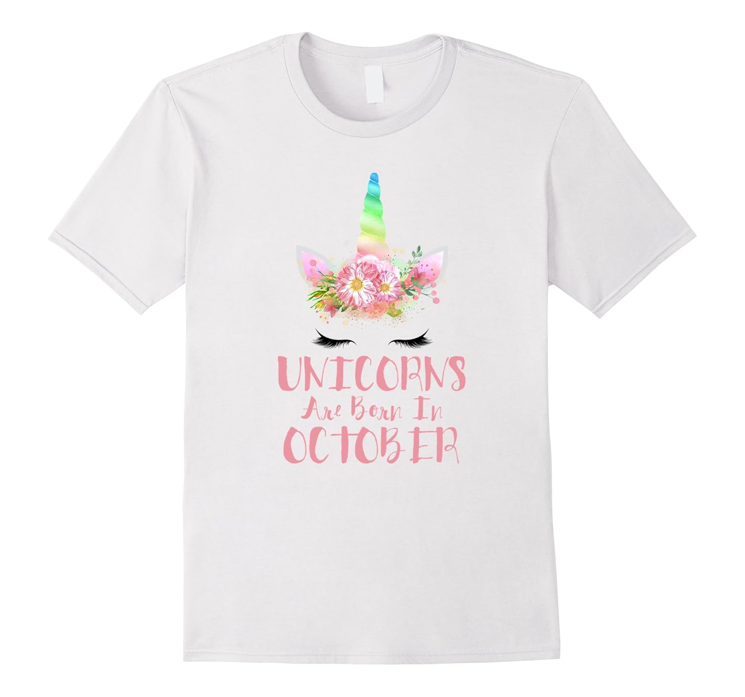 Solid colors: 100% Cotton; Heather Grey: 90% Cotton, 10% Polyester; All Other Heathers: 65% Cotton, 35% Polyester, Imported, Machine wash cold with like colors, dry low heat, Unicorns are born in October! Super cute rainbow unicorn horn with pink flower crown is perfect for any girl, boy or kids to wear to school, your birthday party, or anytime! Wear as you Halloween costume! Way better than a dabbing unicorn that dabs!, Original graphic design available only here! Makes a great gift for birthday, anniversary, Christmas, Mother”s Day, Father”s Day or any holiday! Wear under your unicorn onsie!, Lightweight, Classic fit, Double-needle sleeve and bottom hem