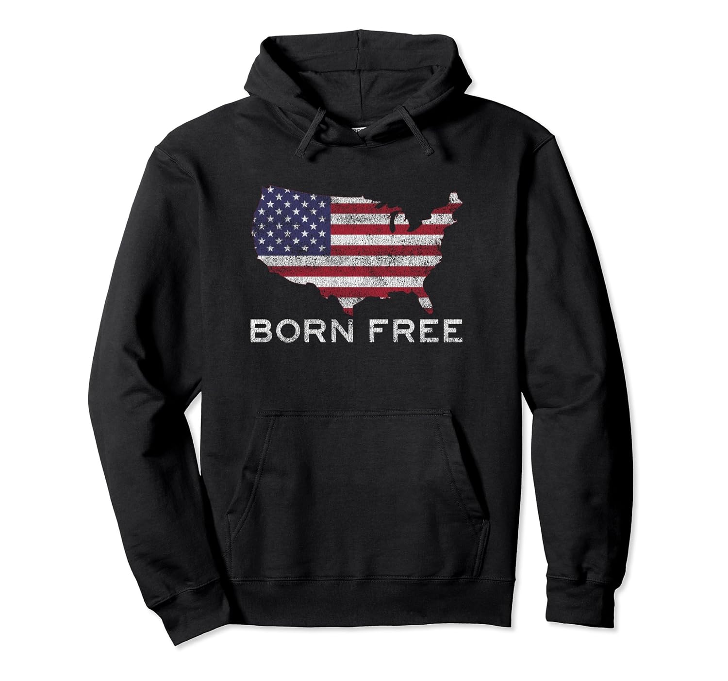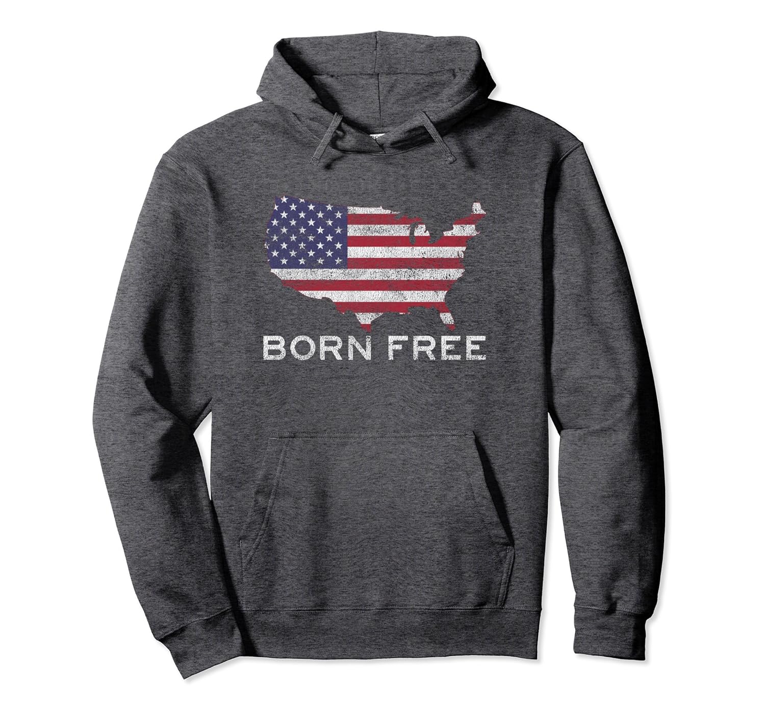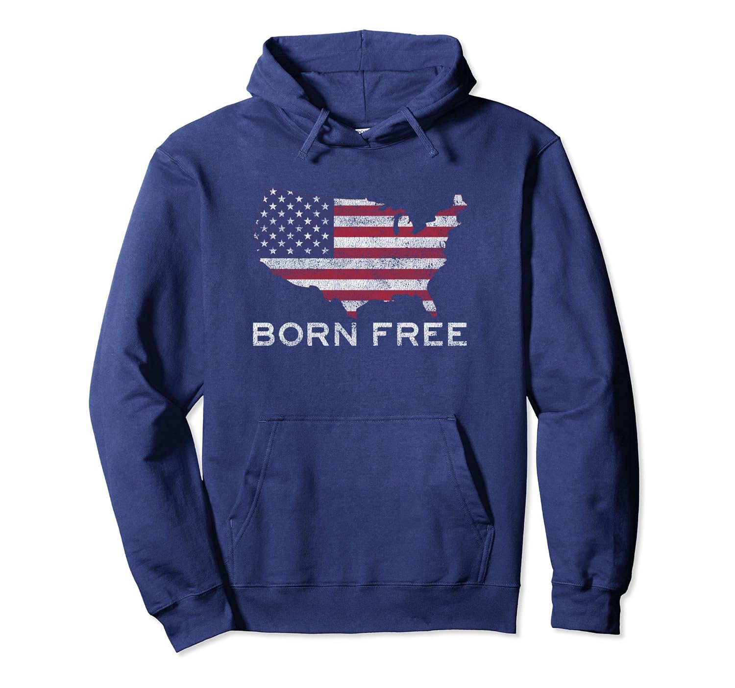 Solid colors: 80% Cotton, 20% Polyester; Heather Grey: 78% Cotton, 22% Poly; Dark Heather: 50% Cotton, 50% Polyester; Imported; Machine wash cold with like colors, dry low heat; Our distressed United States of America Map Flag Born Free Hoodie is the perfect hooded sweatshirt for true patriots who love this beautiful country, the United States of America. Its a great gift idea for a birthday, Christmas, or the fourth of July.; People who like Independence Day, the 4th of July, the American Flag, or patriotic songs like our National Anthem will love this hoodie. Great present for Men, Women and Kids.; 8.5 oz, Classic fit, Twill-taped neck