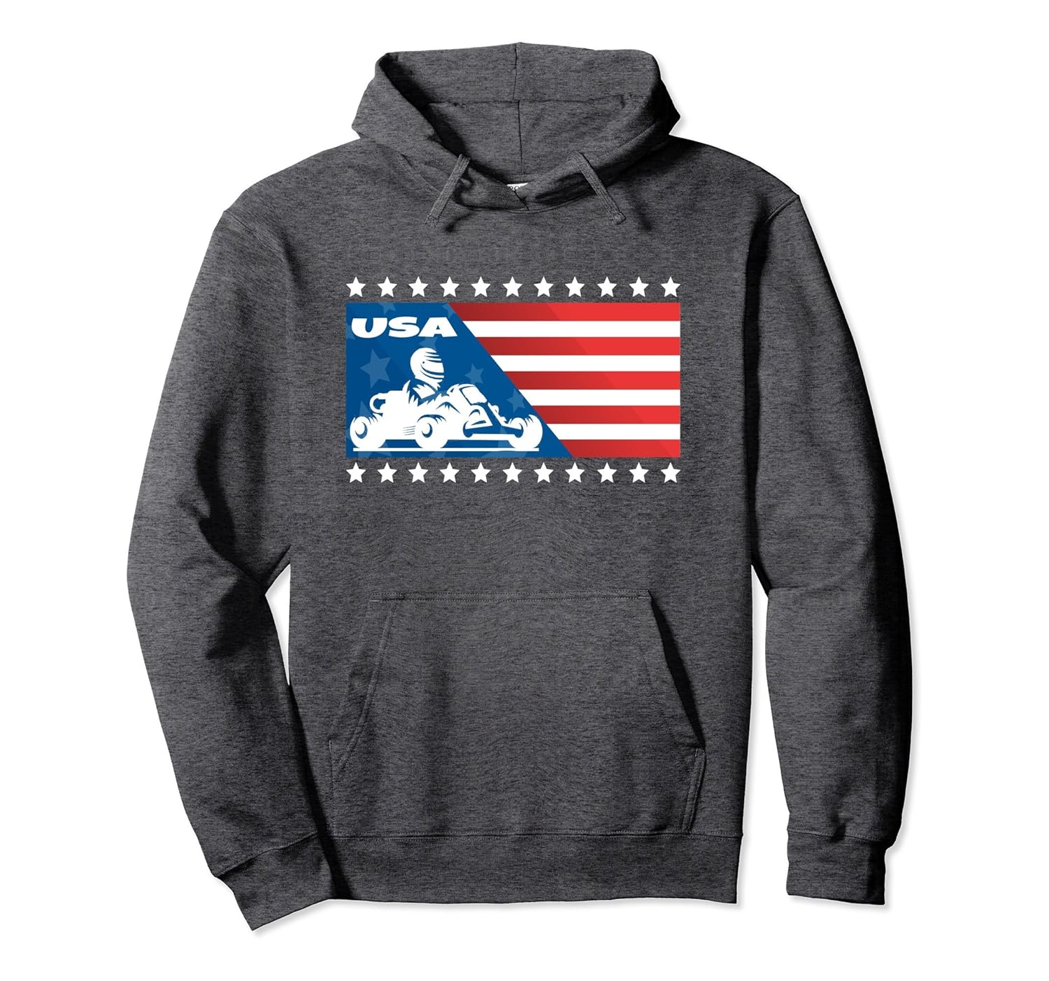 Solid colors: 80% Cotton, 20% Polyester; Heather Grey: 78% Cotton, 22% Poly; Dark Heather: 50% Cotton, 50% Polyester; Imported; Machine wash cold with like colors, dry low heat; USA Flag Go-Kart Hoodie Go Kart Hoodie for Kids and Adults; 8.5 oz, Classic fit, Twill-taped neck