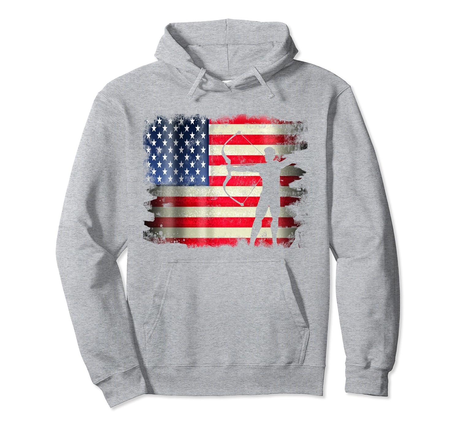 Solid colors: 80% Cotton, 20% Polyester; Heather Grey: 78% Cotton, 22% Poly; Dark Heather: 50% Cotton, 50% Polyester; Imported; Machine wash cold with like colors, dry low heat; This is an awesome hoodie that expresses love for American pride and archery. Features an archer and a retro distressed USA American flag. Great to wear to a Memorial Day, 4th of July or Independence day event!; Makes a great novelty gift idea for bow and arrow enthusiasts and United States Of America lovers. Perfect for those who likes wearing Fourth Of July themed hoodies and apparel.; 8.5 oz, Classic fit, Twill-taped neck