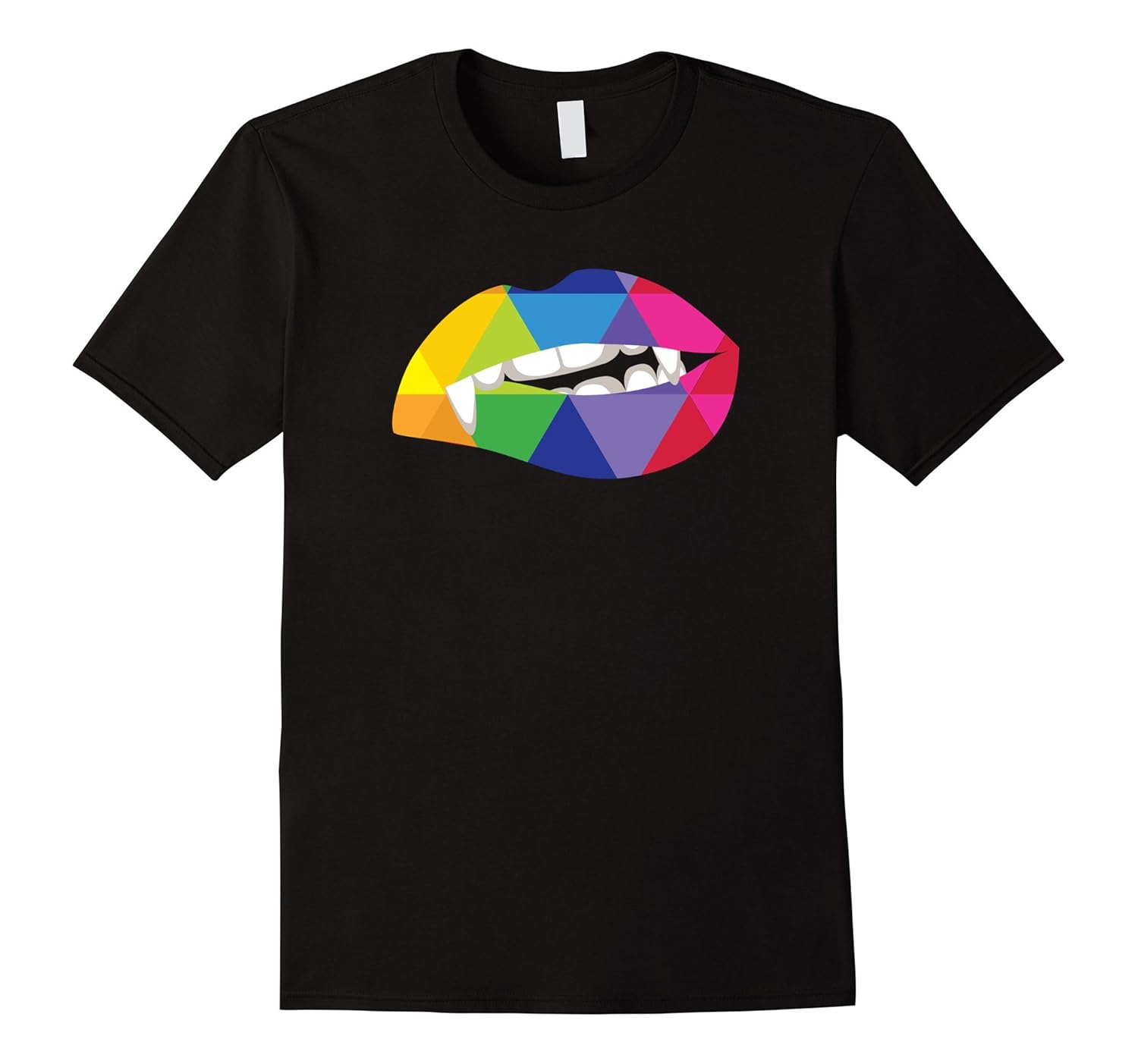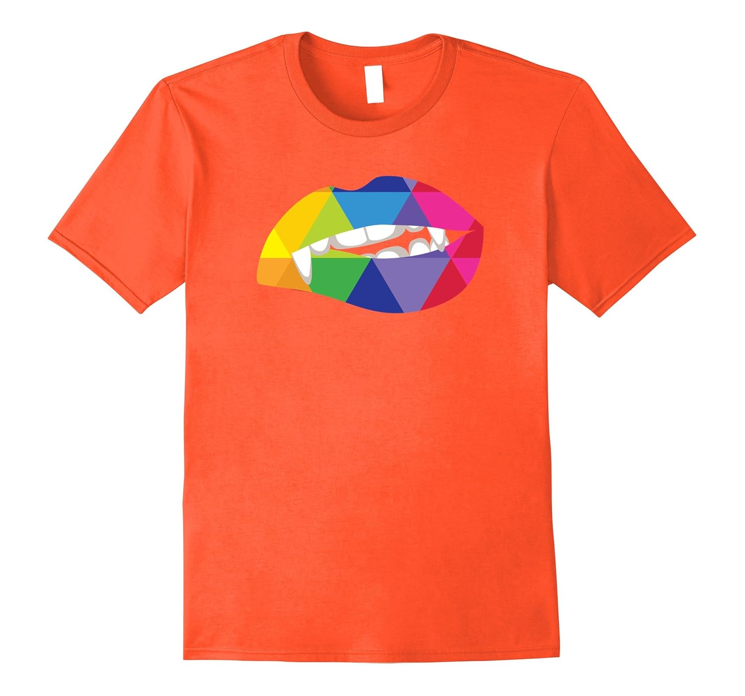Solid colors: 100% Cotton; Heather Grey: 90% Cotton, 10% Polyester; All Other Heathers: 65% Cotton, 35% Polyester, Imported, Machine wash cold with like colors, dry low heat, Funny colorful tshirt with a colorful lip showing vampire teeth for the true vampire or Halloween lover (tee colors: white, black, orange), Unique custom shirt design with bright colors for people who love to celebrate Halloween and scaring people. Designed by a small business Hider House in Houston, Texas. Made in the USA, Lightweight, Classic fit, Double-needle sleeve and bottom hem