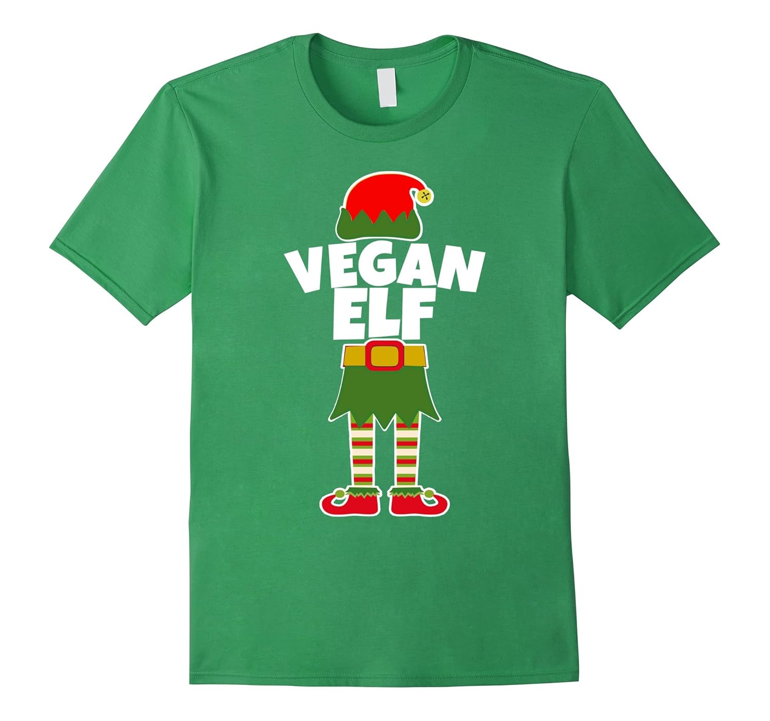 Solid colors: 100% Cotton; Heather Grey: 90% Cotton, 10% Polyester; All Other Heathers: 65% Cotton, 35% Polyester; Imported; Machine wash cold with like colors, dry low heat; VEGAN ELF – Vegans will love this cute Holiday design. Perfect gift for the vegetarian in your life! Give this as an early Christmas present so vegans can enjoy it all the way up to Christmas Day!; With a little elf hat and striped legs, this Holiday career shirt will be a festive way to celebrate the Holiday Season in your job, office, school or just out Christmas shopping. Matching shirts for the whole family available.; Lightweight, Classic fit, Double-needle sleeve and bottom hem