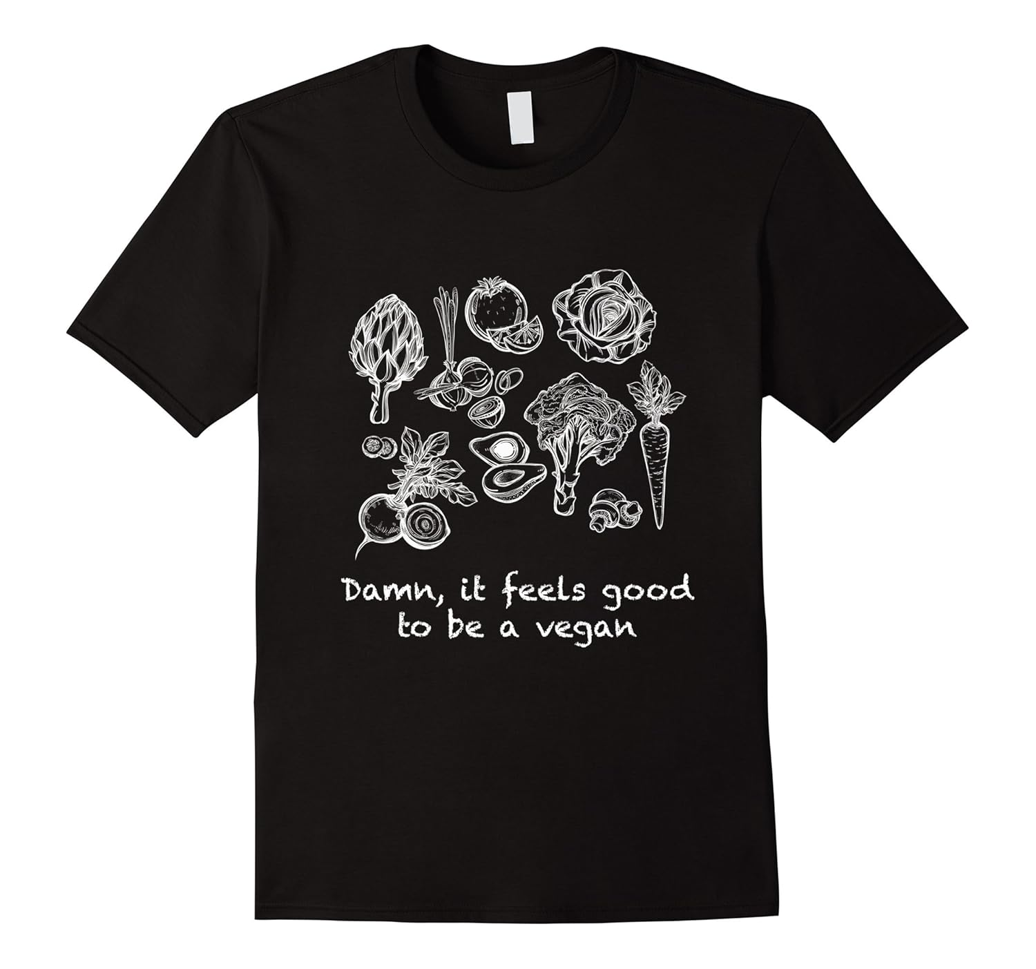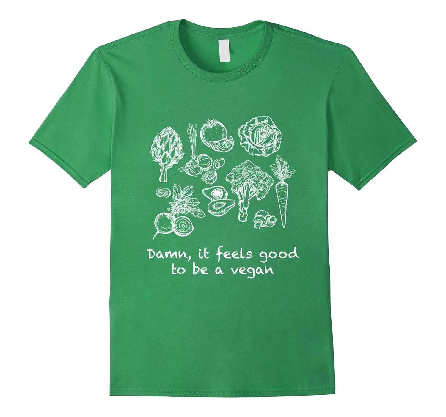 Solid colors: 100% Cotton; Heather Grey: 90% Cotton, 10% Polyester; All Other Heathers: 65% Cotton, 35% Polyester, Imported, Machine wash cold with like colors, dry low heat, Vegan T-shirt, Text on the shirt reads: Damn, it feels good to be a vegan, Lightweight, Classic fit, Double-needle sleeve and bottom hem