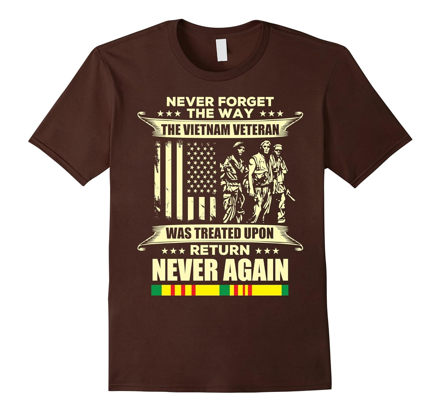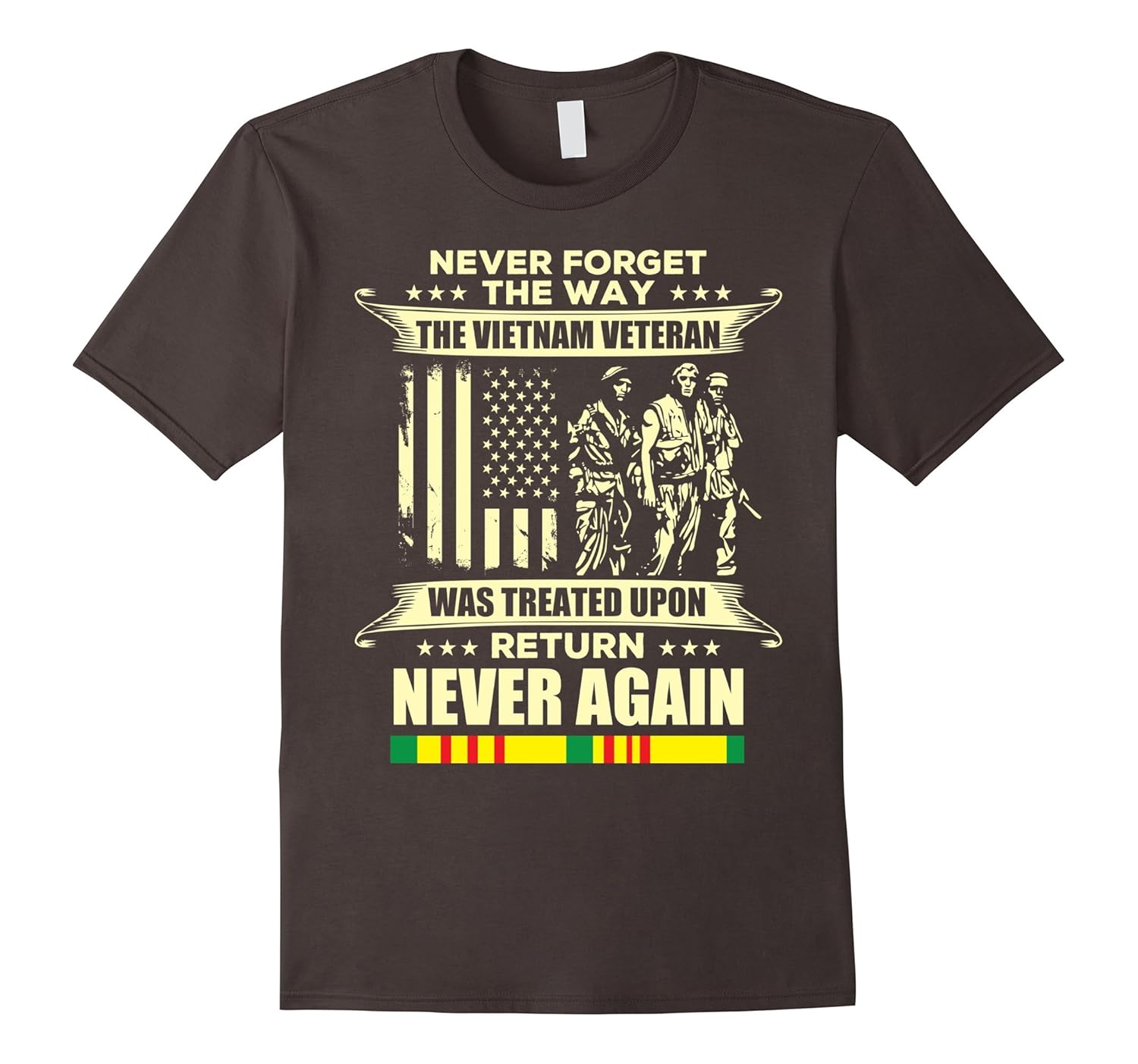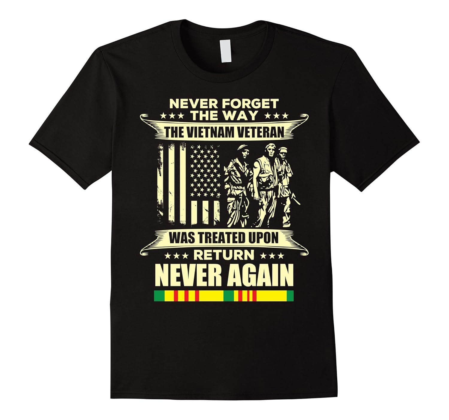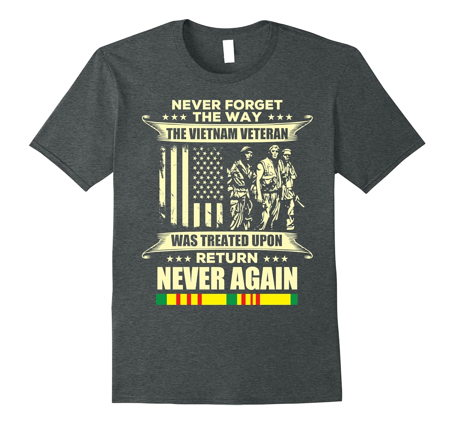Solid colors: 100% Cotton; Heather Grey: 90% Cotton, 10% Polyester; All Other Heathers: 65% Cotton, 35% Polyester, Imported, Machine wash cold with like colors, dry low heat, Never forget the way the Vietnam Veteran was treated upon return never again.Vietnam veteran, vietnam war t shirt, veteran day t shirt, veteran day gift, gift for veterans. Give this to your dad, father, uncle, grandpa, grandfather, granddad or any old man American veteran who served in Vietnam war. They can wear it on Veterans Day, Labor Day, Independence Day, Memorial Day, Flag Day and on the 4th of July. Lightweight, Classic fit, Double-needle sleeve and bottom hem