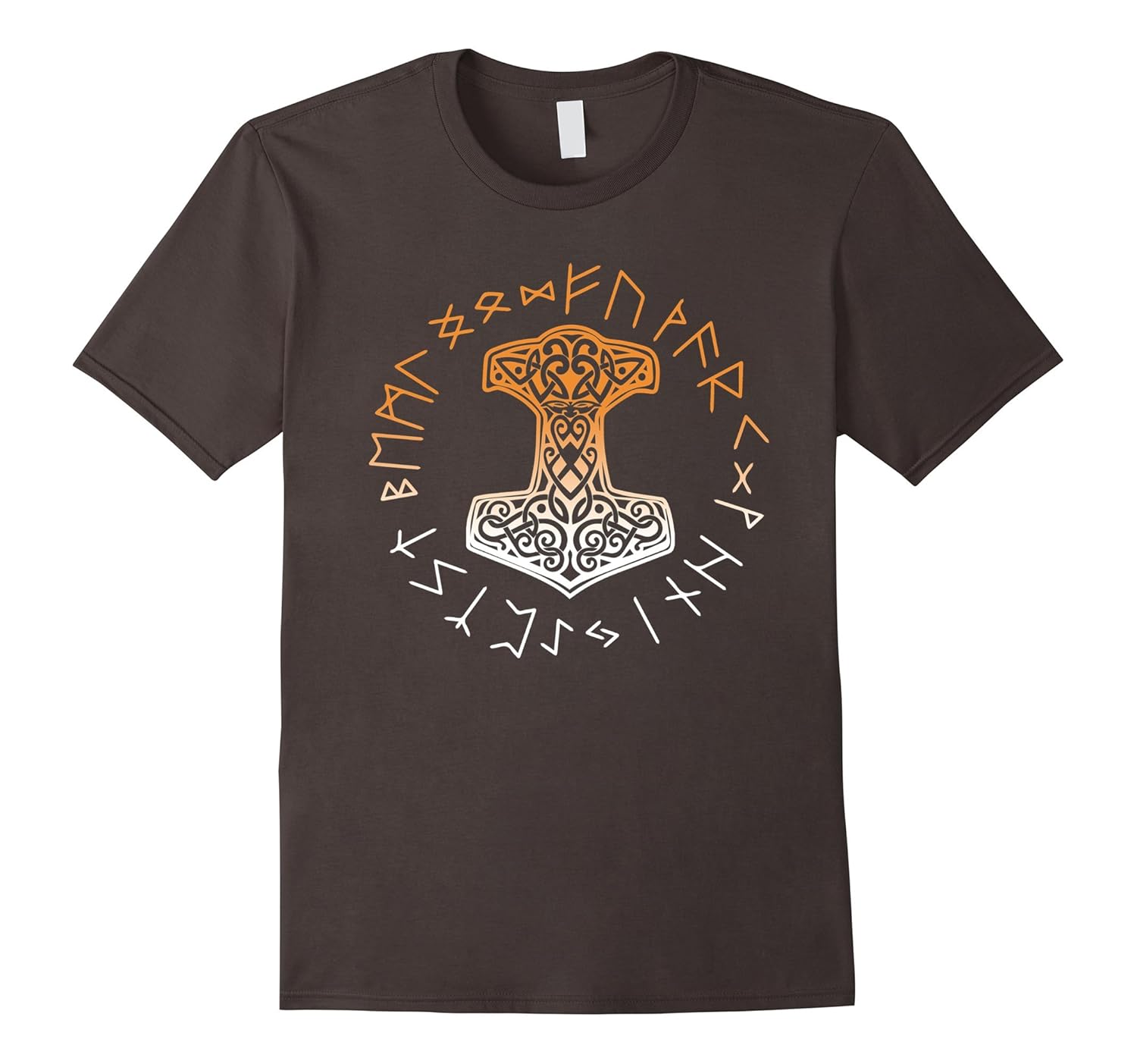 Solid colors: 100% Cotton; Heather Grey: 90% Cotton, 10% Polyester; All Other Heathers: 65% Cotton, 35% Polyester, Imported, Machine wash cold with like colors, dry low heat, Vikings Orange White Mjolnir with Norse Runic Wheel tshirt, Viking history and Norse Mythology inspired Scandinavian Pagan tee with runes, Lightweight, Classic fit, Double-needle sleeve and bottom hem