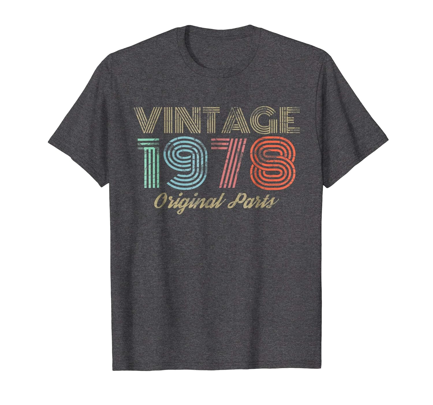 Solid colors: 100% Cotton; Heather Grey: 90% Cotton, 10% Polyester; All Other Heathers: 50% Cotton, 50% Polyester; Imported; Machine wash cold with like colors, dry low heat; Your Vintage 40th Birthday t shirt is here! If you were born in 1978, youre vintage, original, and a legend. This 1978 40th Birthday shirt makes a great gift idea for a fortieth birthday.; Original Parts 1978 40th Birthday Retro Color T-Shirt features a retro color palette, distressed font and simple sleek design make this awesome birthday tee shirt. Perfect 40th birthday gift.; Lightweight, Classic fit, Double-needle sleeve and bottom hem