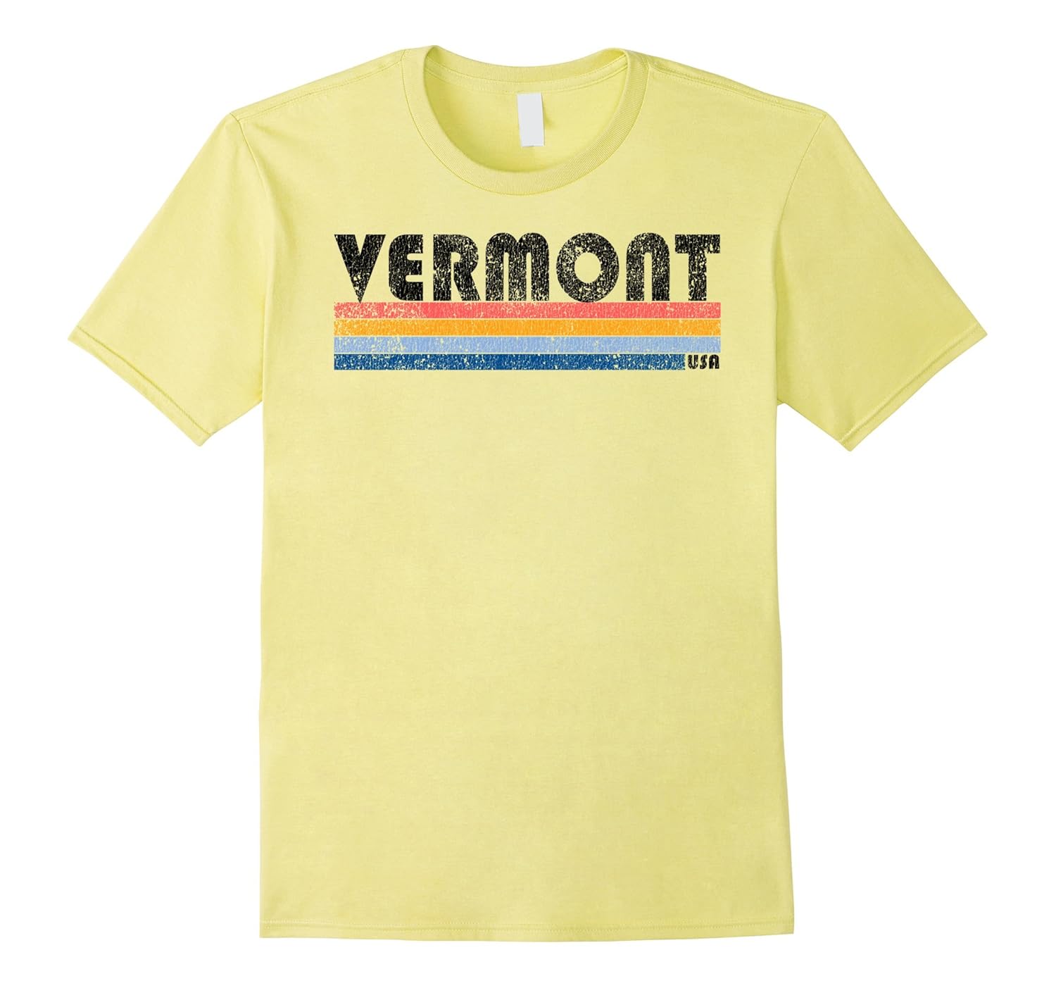 Solid colors: 100% Cotton; Heather Grey: 90% Cotton, 10% Polyester; All Other Heathers: 65% Cotton, 35% Polyester, Imported, Machine wash cold with like colors, dry low heat, This original design state of Vermont makes a great souvenir or gift t-shirt. This graphic tee features a cool distressed retro font with colored stripe underlining. This trendy Vermont shirt is distressed to give it a vintage classic look and is sure to be a hit whenever you wear it. If you prefer a looser fit, please order up a size. Lightweight, Classic fit, Double-needle sleeve and bottom hem