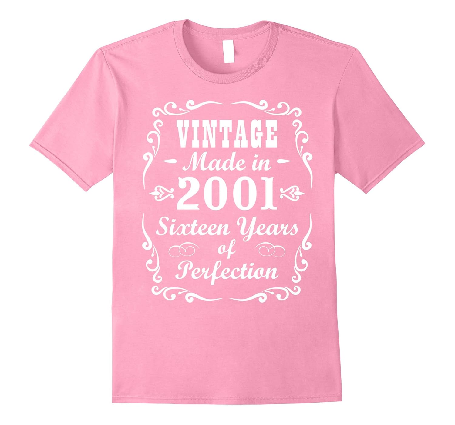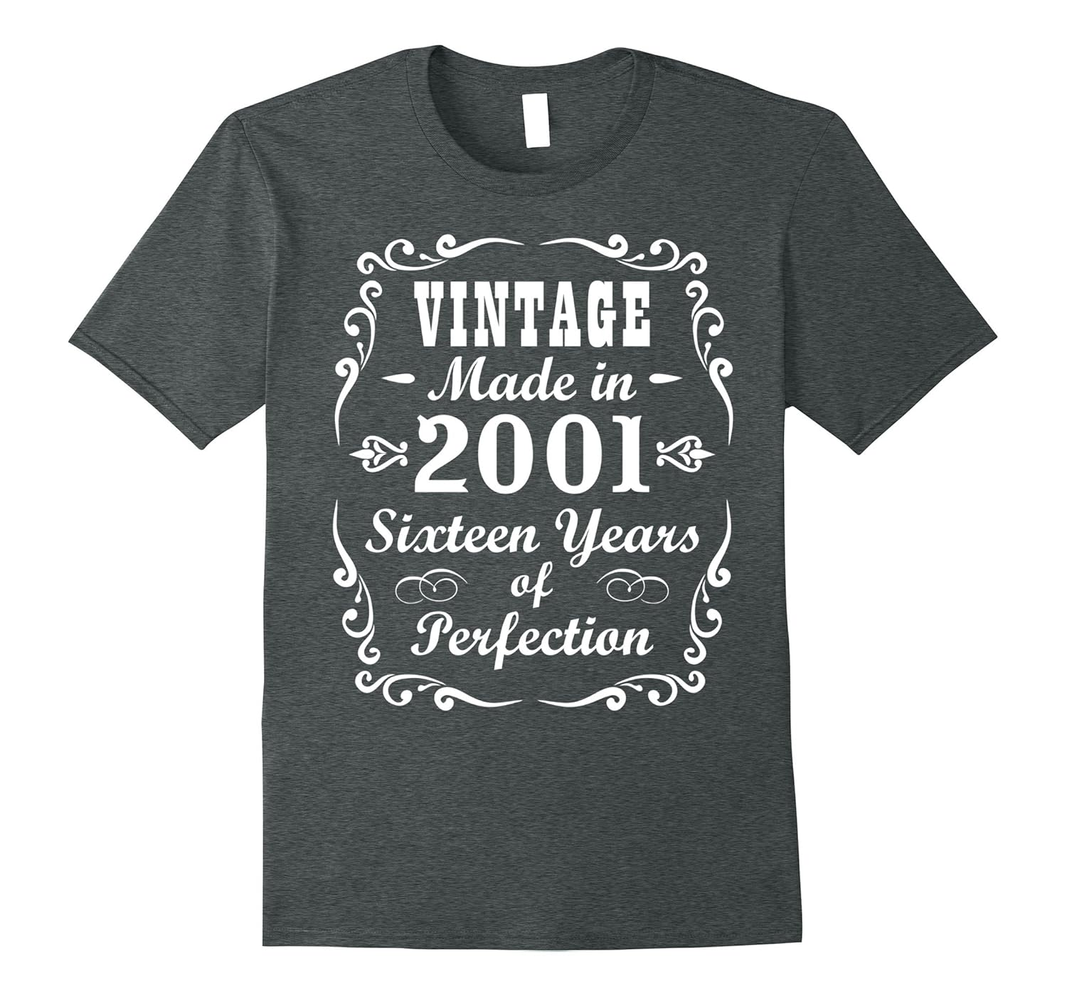 Solid colors: 100% Cotton; Heather Grey: 90% Cotton, 10% Polyester; All Other Heathers: 65% Cotton, 35% Polyester, Imported, Machine wash cold with like colors, dry low heat, Vintage 16 Years Old Birthday Gift Idea for Girls and Boys Made in 2001 year is a perfect gift! Sweet Birthday Sixteen Years of Perfection for teenagers turning 16 in 2017! This tshirt is really great b-day gift tor a teen born in 2001. Runs small, size up, This is great Sweet 16 Shirt for daughter and son. Super cute shirt for Daughter”s 16th Birthday. Nice shirt for Son”s block party. A gift to daughter for Sweet 16. Awesome t-shirt for the teen. Great party bag item for granddaughter”s sweet party bday. Lightweight, Classic fit, Double-needle sleeve and bottom hem