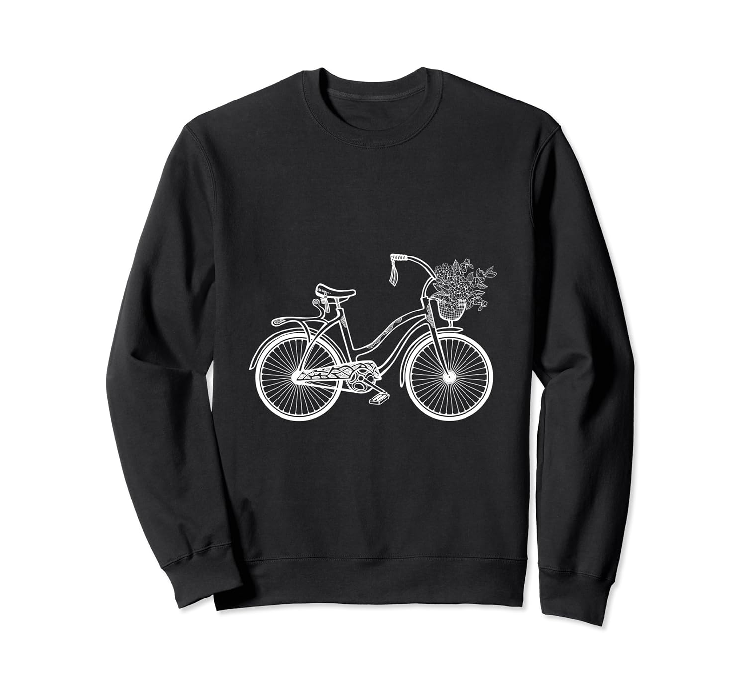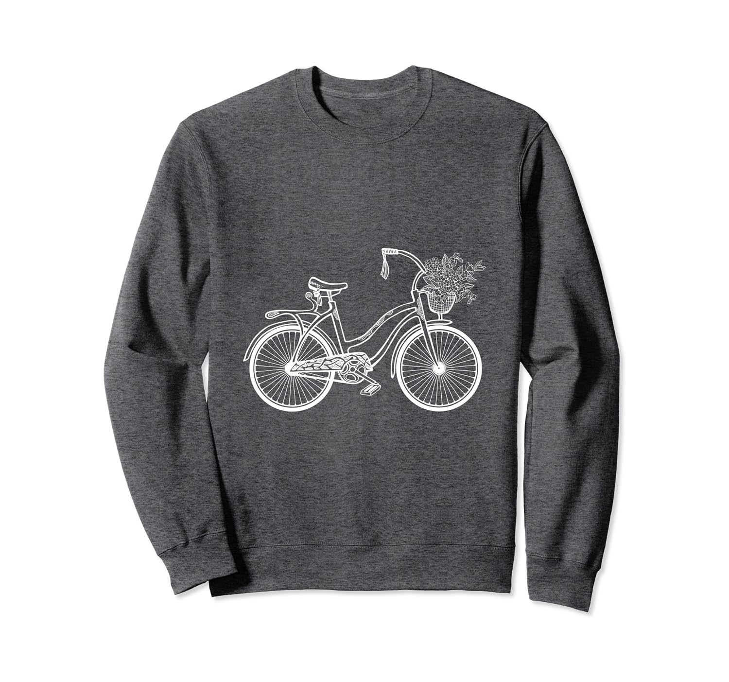 Solid colors: 80% Cotton, 20% Polyester; Heather Grey: 78% Cotton, 22% Poly; Dark Heather: 50% Cotton, 50% Polyester; Imported; Machine wash cold with like colors, dry low heat; This long sleeve sweatshirt has a classic bicycle on it. Its illustrated using a cute hand-drawn artwork style. The old-school bicycle suits perfectly the cute flowers it has on the basket. This sweater is perfect both for urban Andamp; country-side riders!; Boho and new-age youngsters will love wearing this long sleeve sweater pullover with a drawing inspired on the XIX century classical fashion Andamp; traditional customs. Make your friends Andamp; family thrill with your originality and become the classiest among them!; 8.5 oz, Classic fit, Twill-taped neck
